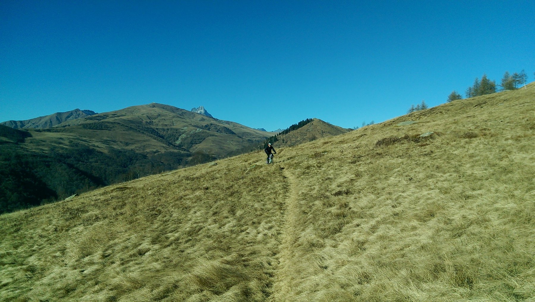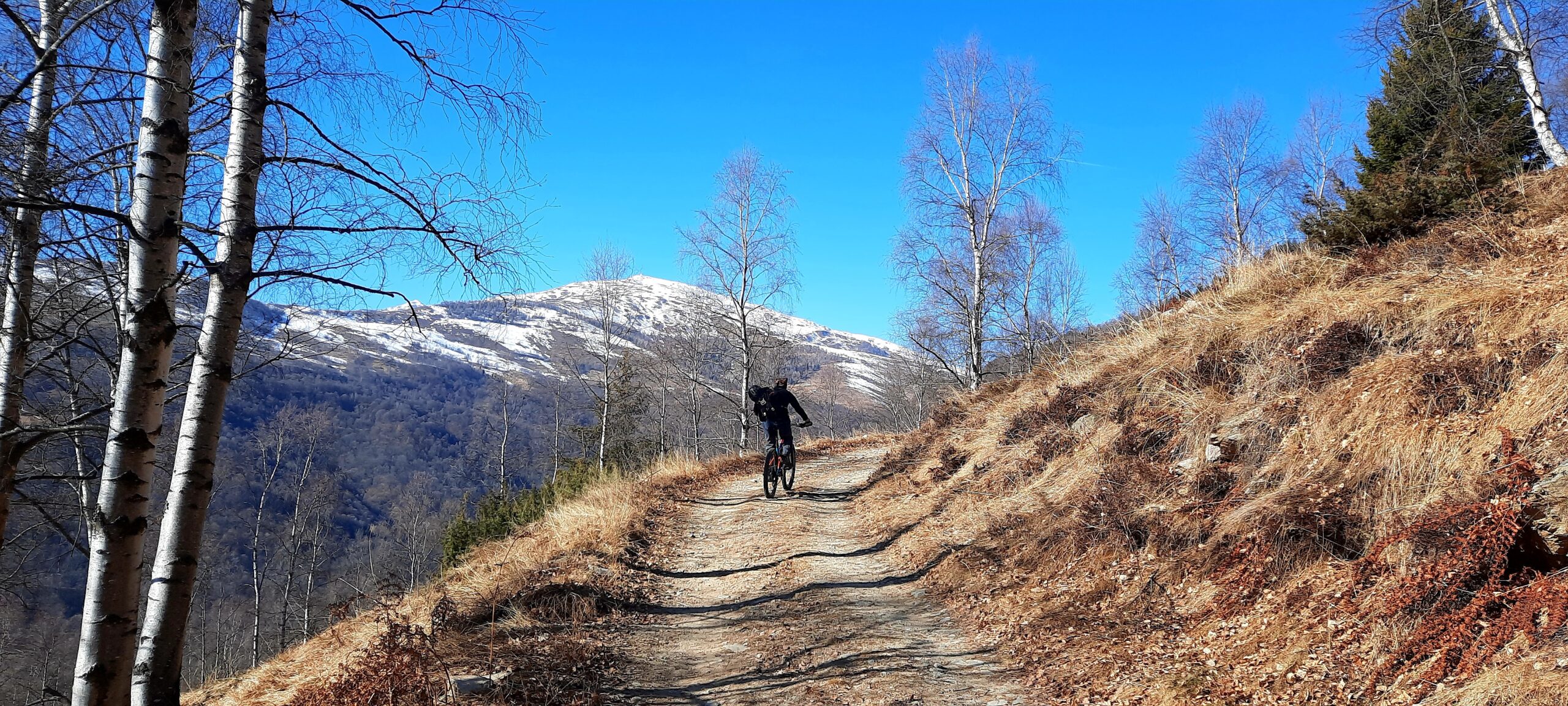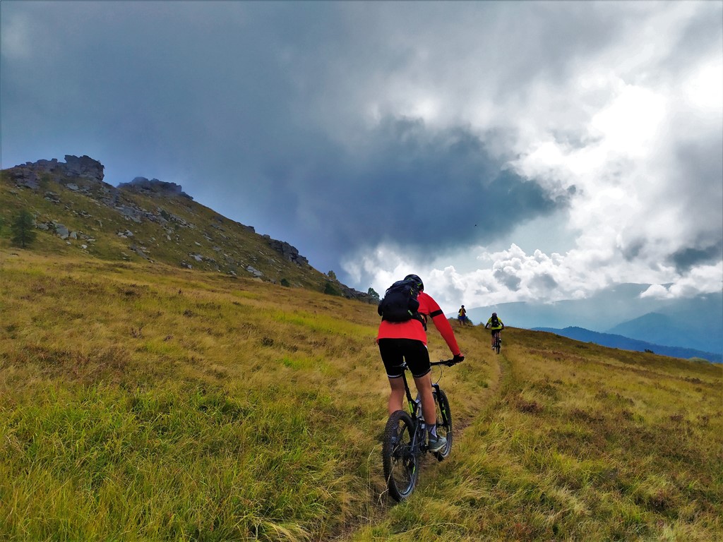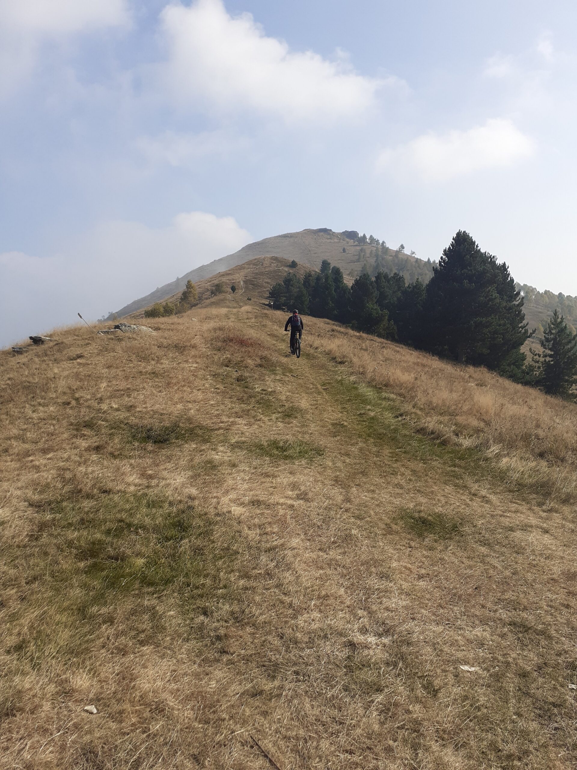 Tralasciata sulla dx una traccia che scende a Martiniana e superata la località Pra la Tampa si deve abbandonare la sterrata che dopo pochi metri comincerebbe a scendere per seguire sulla dx un sentiero ben segnalato inizialmente in forte salita. Il sentiero non è ciclabile nel primo tratto ma in breve diventa pressochè pianeggiante e ben ciclabile.
