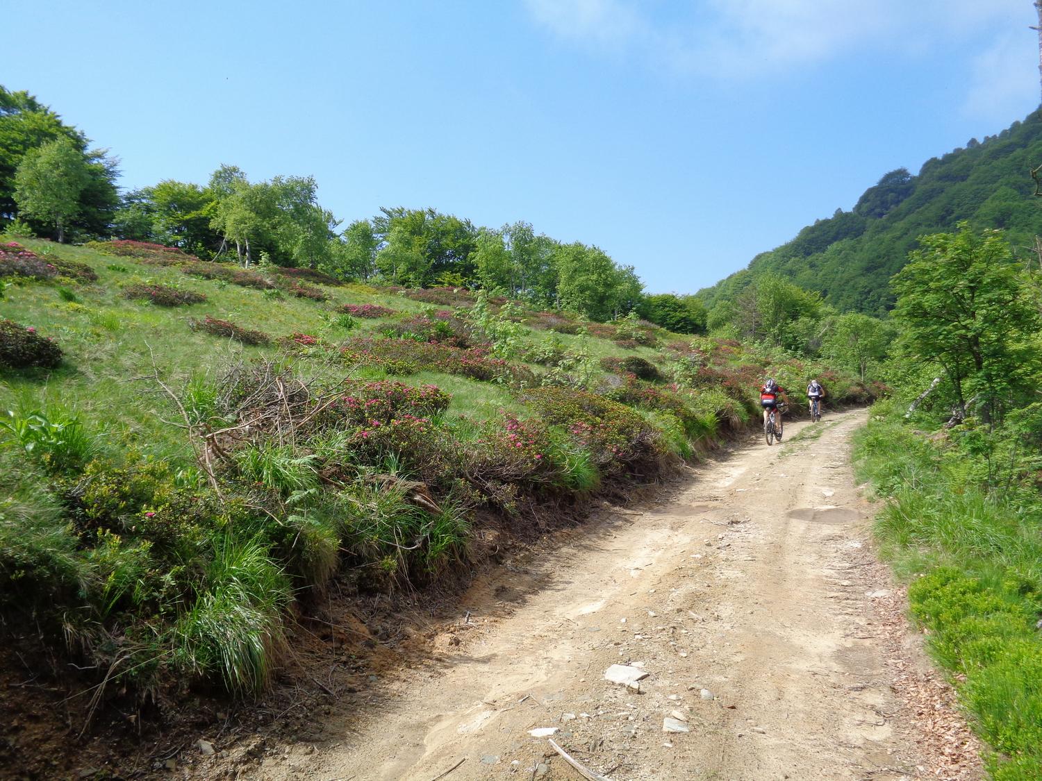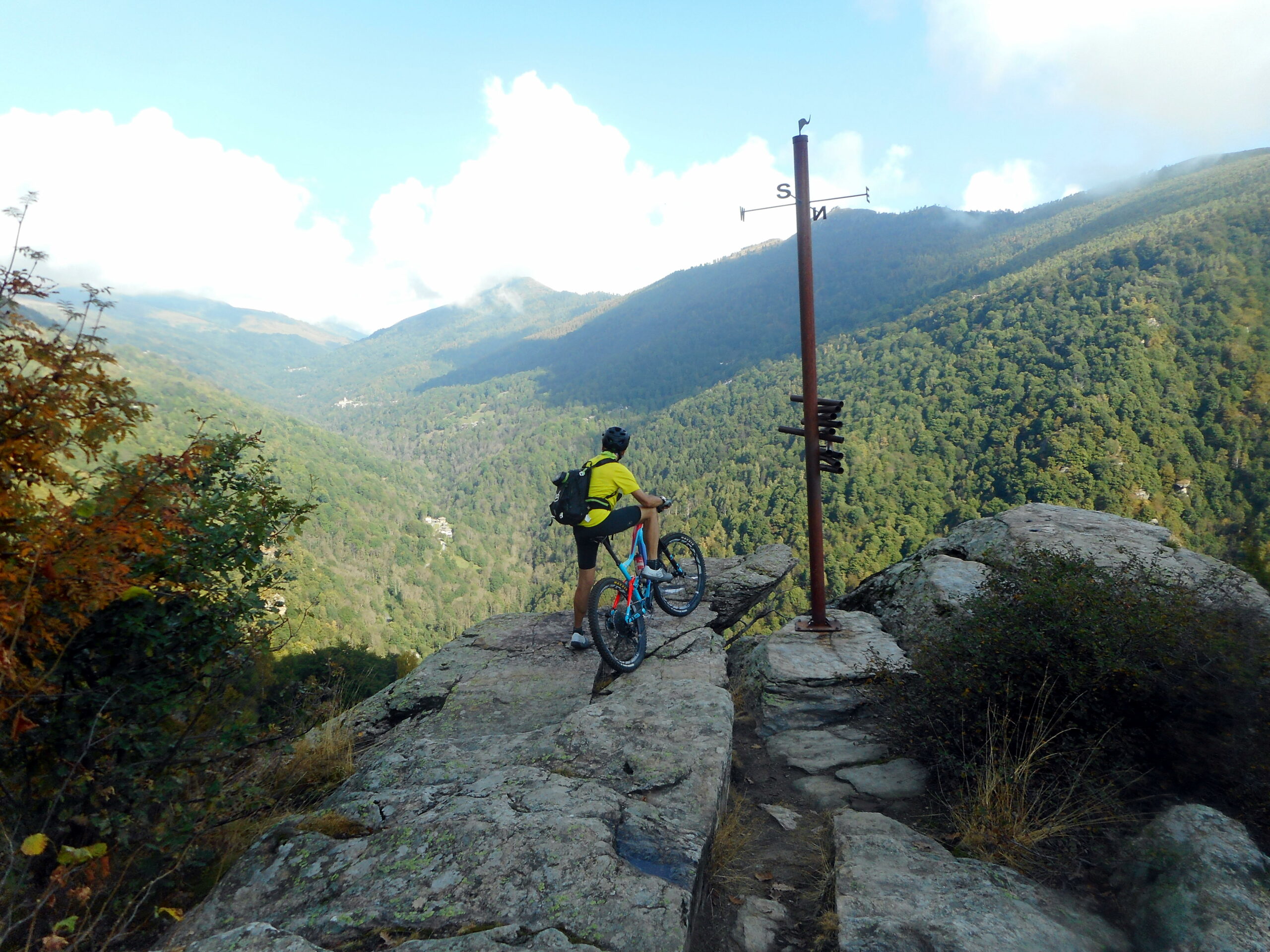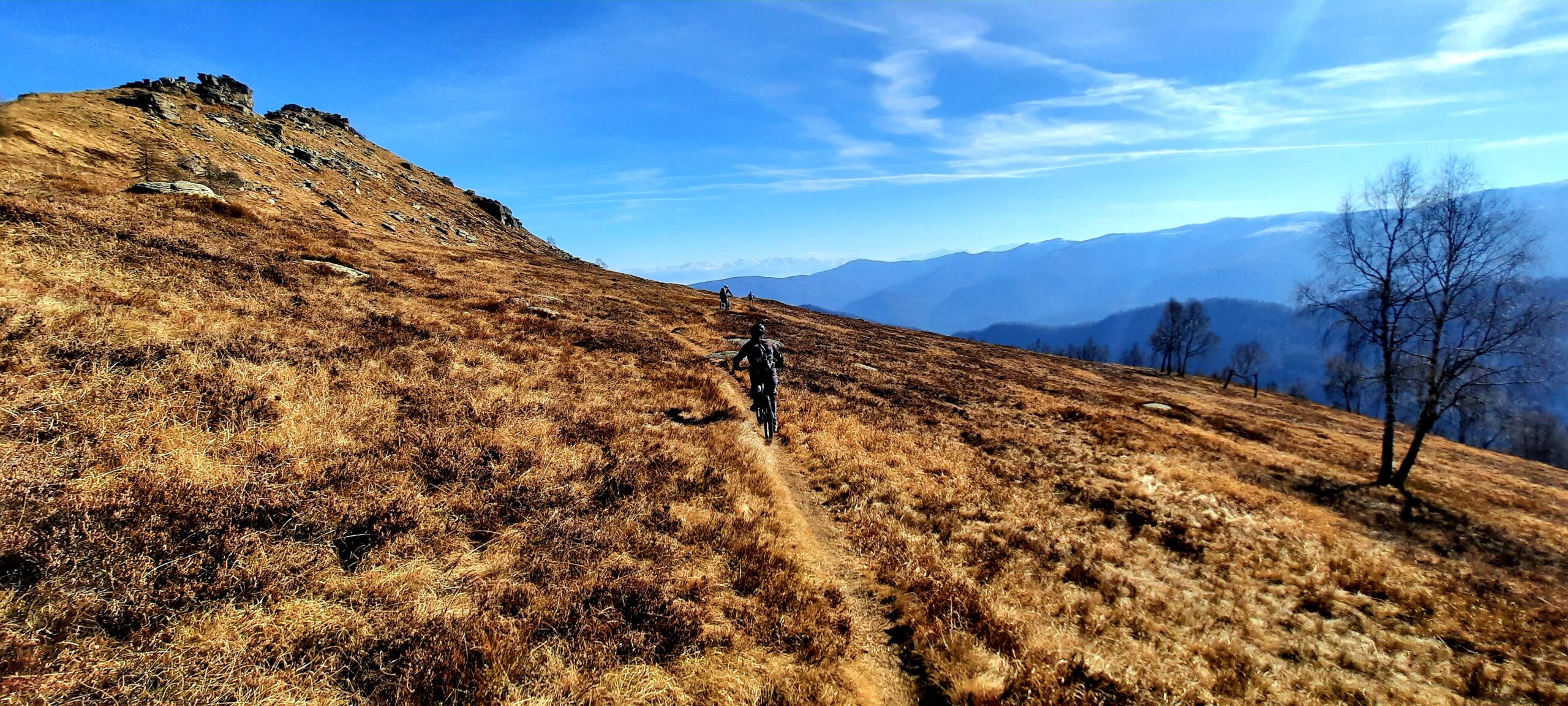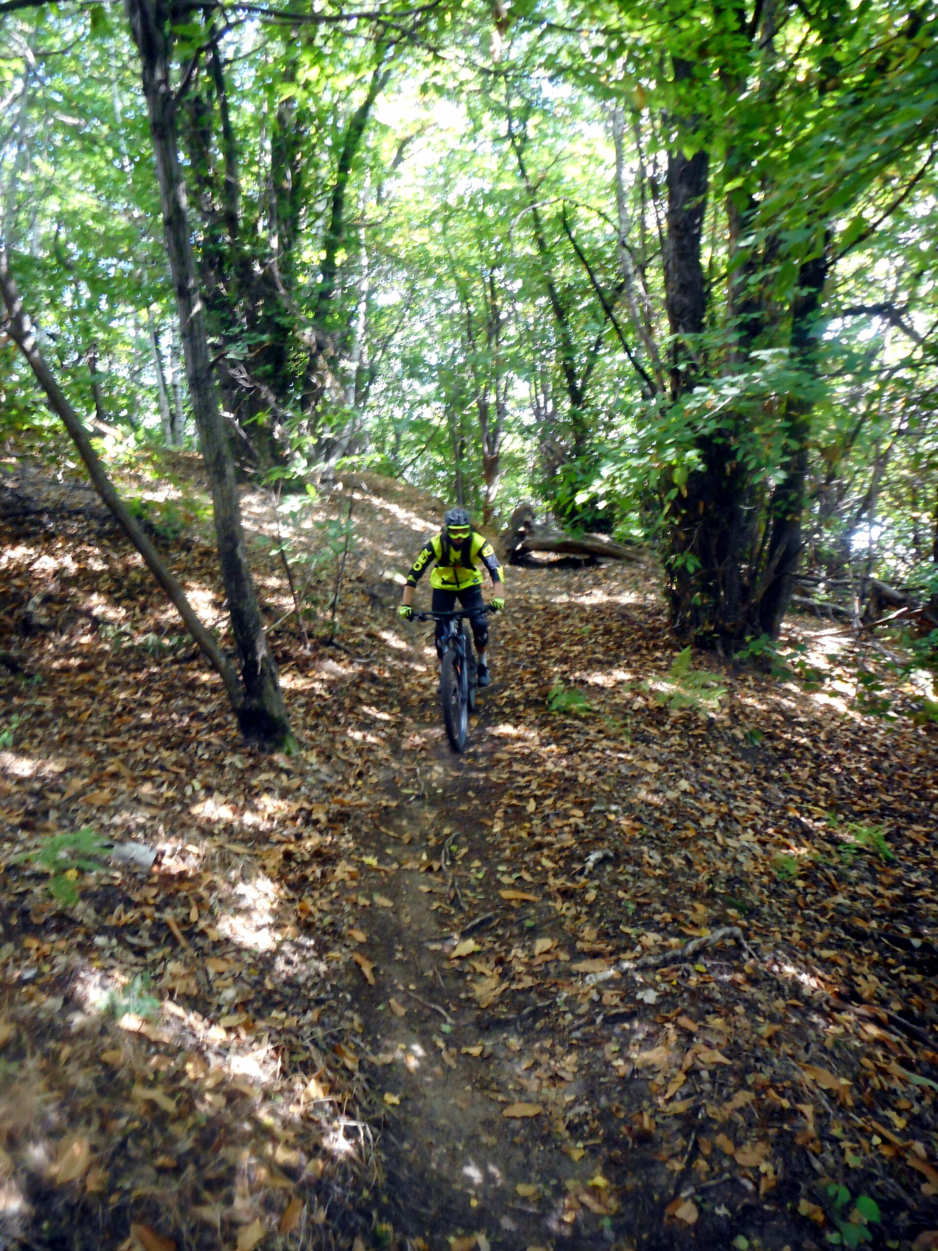 Tralasciata sulla dx una traccia che scende a Martiniana e superata la località Pra la Tampa si deve abbandonare la sterrata che dopo pochi metri comincerebbe a scendere per seguire sulla dx un sentiero ben segnalato inizialmente in forte salita. Il sentiero non è ciclabile nel primo tratto ma in breve diventa pressochè pianeggiante e ben ciclabile.