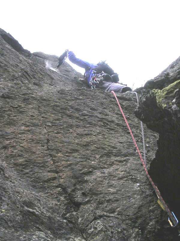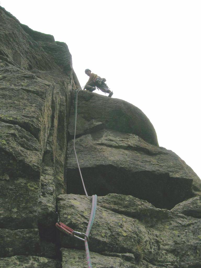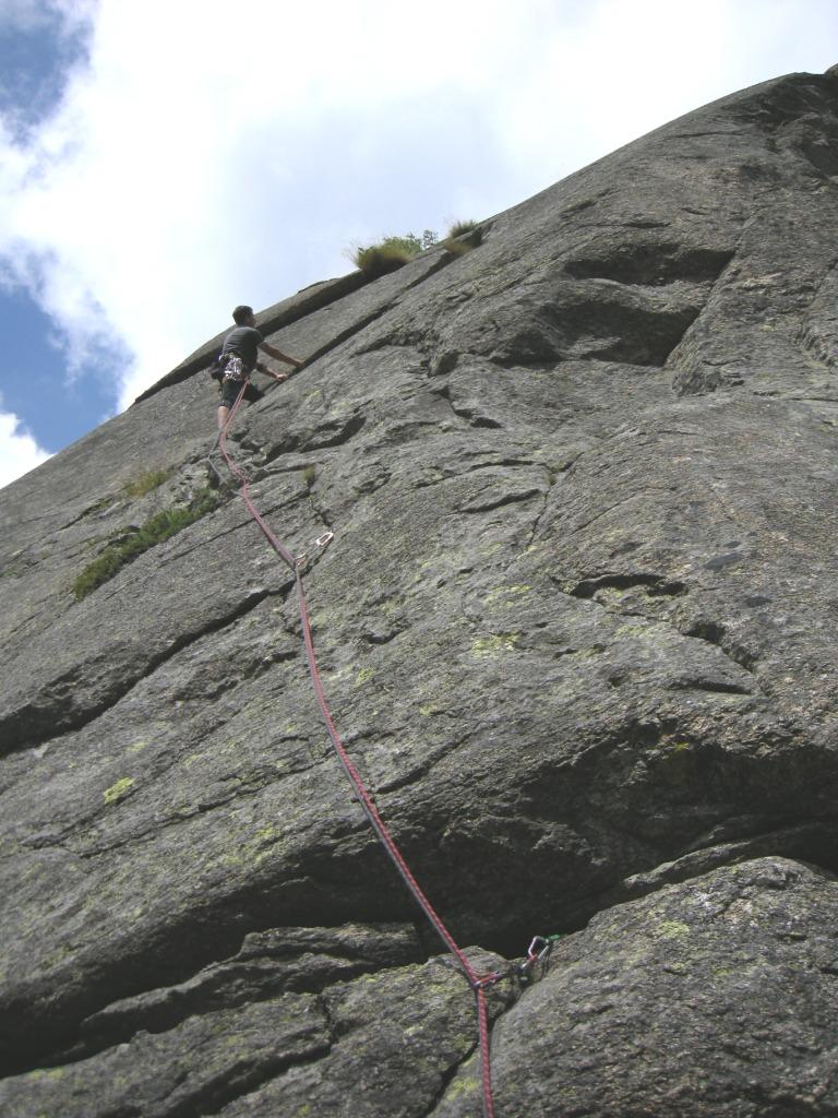 - L6: Placca e poi lama delicata, uscendo sulla sommità dove si sosta a una betulla con cordone.