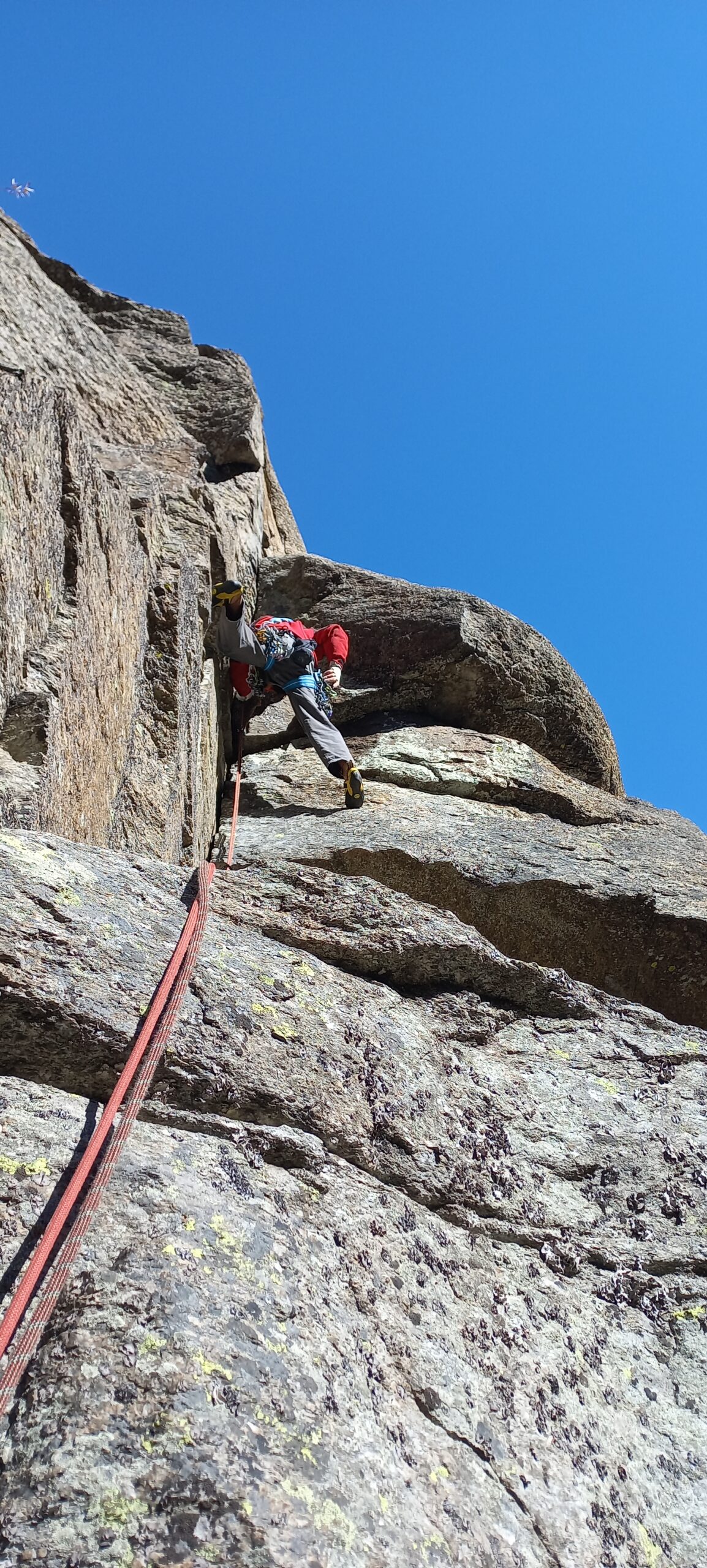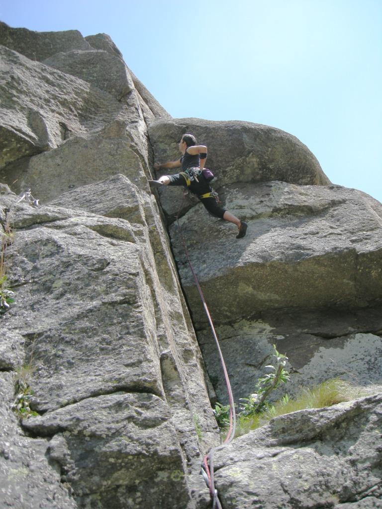 - L4: tiro stupendo lungo diedro fessurato tutto da proteggere, con uscita su roccia levigata 6a+. Sosta su pianta