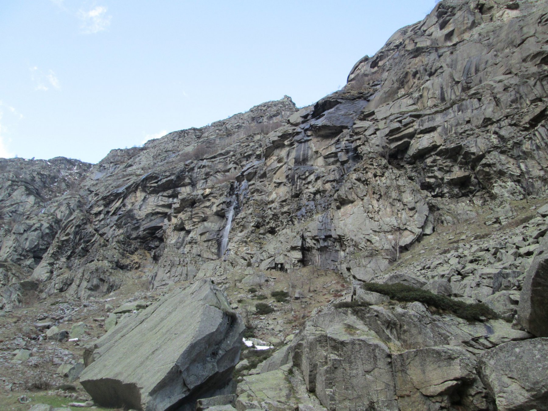 Guadagnare una cengia – rampa e lasciaare gli zaini sul terrazzo roccioso che ne costituisce l’esile spianata. Salire slegati uno zoccolo erboso – roccioso (passi di II° e III°; 1 chiodo eventualmente fosse bagnato)e raggiungere la S0 su due spit (rossi) con cordone.