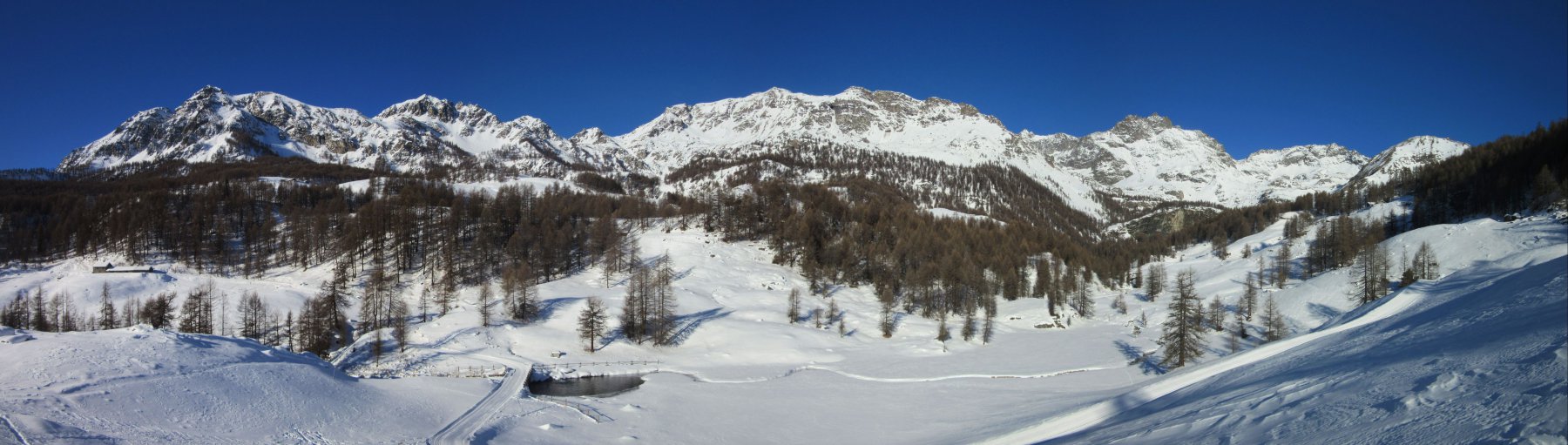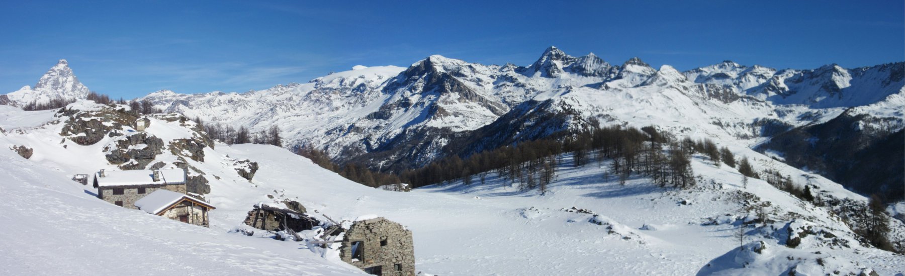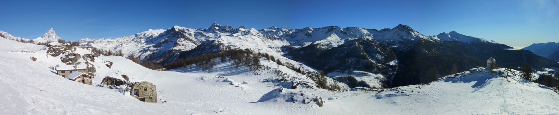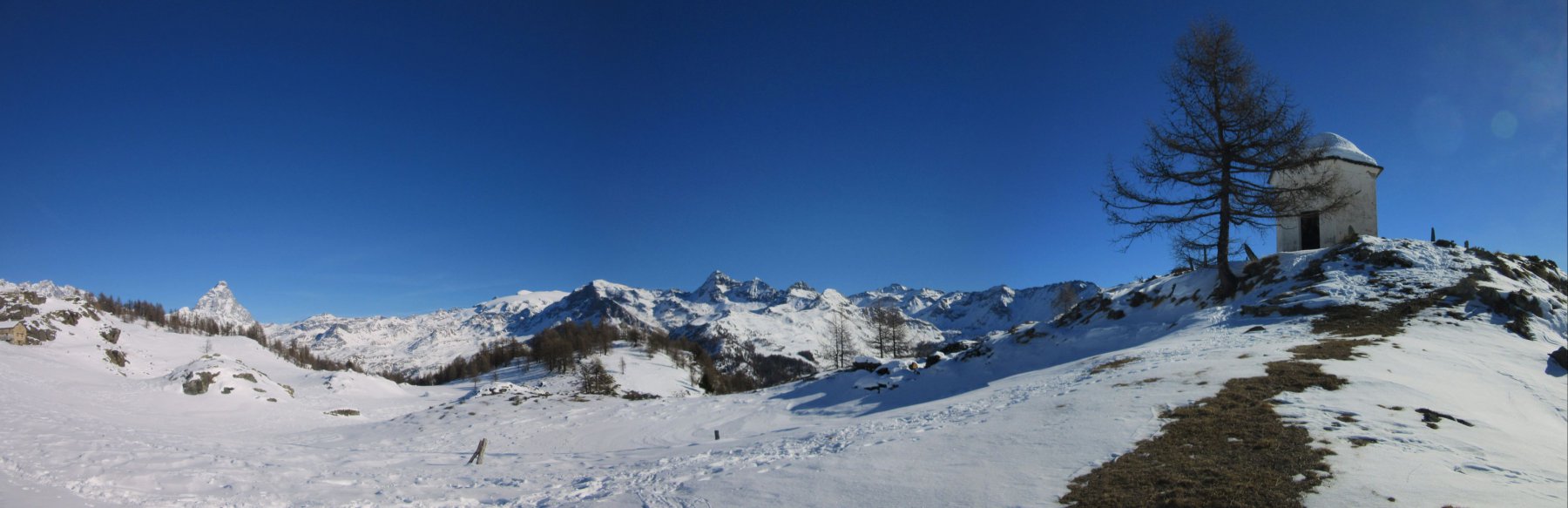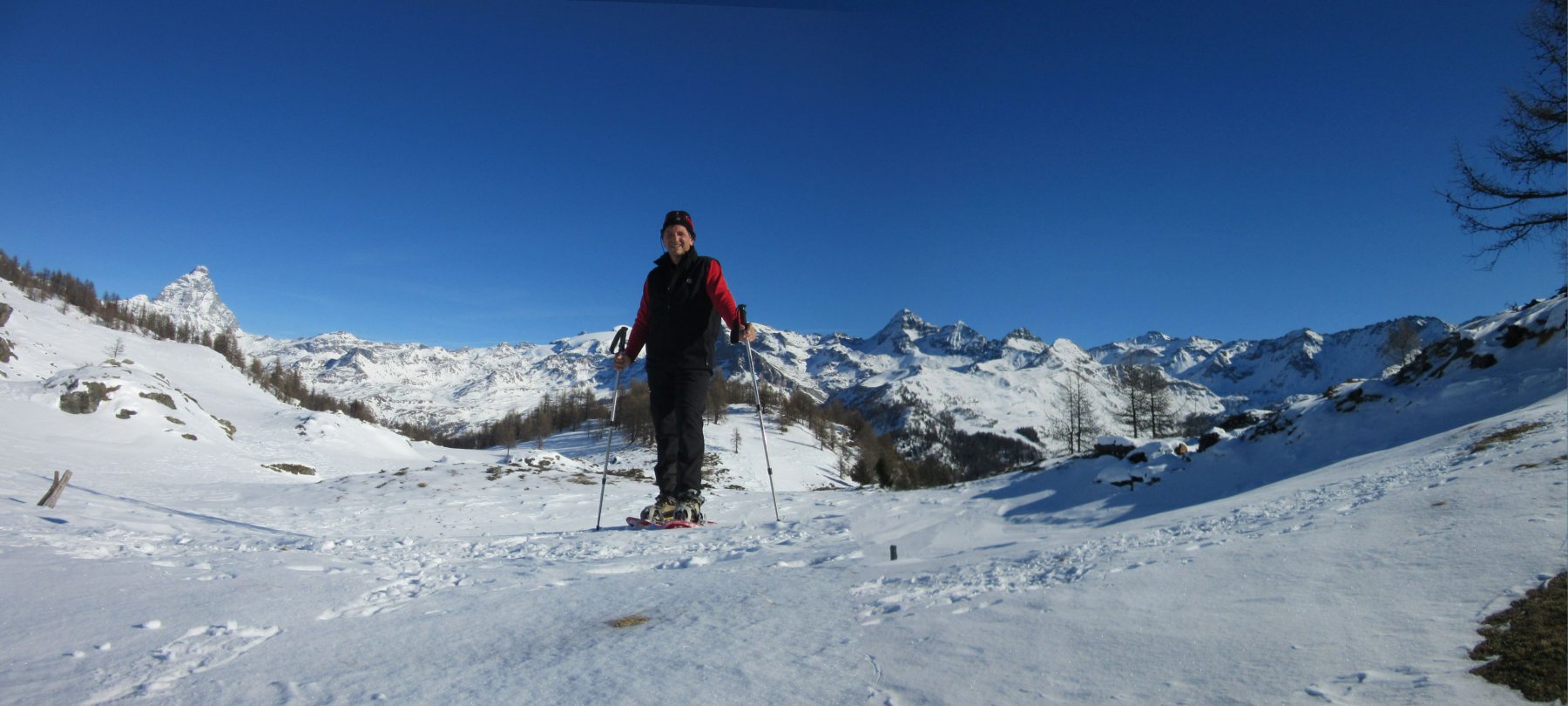 Giornata stupenda e anche troppo calda. Percorso interamente tracciato adatto a tutti senza alcun pericolo. Panorami stupendi sulle principali cime della Valtournanche. Visti due ciaspolatori e tre fondiste. Gita effettuata in solitudine.