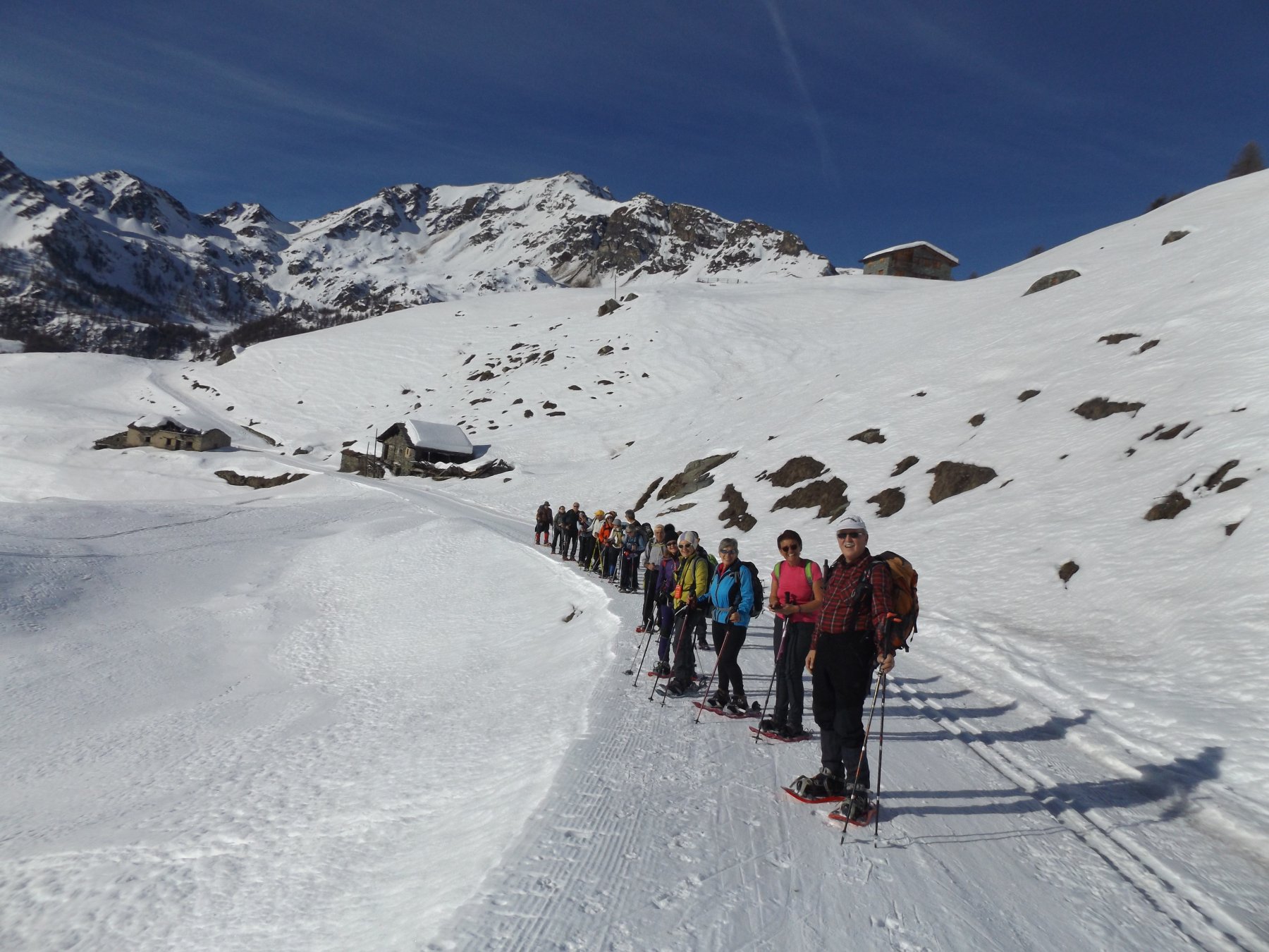 Oggi ritorno a distanza di alcuni anni all’oratoro di Gilliarey – Una bellissima gita con il CAI Senior Ivrea in una bella giornata di sole e con una neve eccezionale – Partiti da Etirol e portage delle ciaspole per 15 min., poi neve continua, risaliti lungo la gola del torrente sino a raggiungere il pianoro superiore da dove lo sguardo si apre sulle cime della conca di Torgnon, proseguito lungo il torrente sino a raggiungere il ponticello, da dove abbiamo risalito senza traccia, il ripido pendio sino all’alpeggio Cret, dopo una breve pausa abbiamo proseguito dietro all’alpeggio raggiungendo la poderale (pista di fondo) che porta a Gilliarey – Dall’oratorio panorama eccezionale sulla Gran Becca (Cervino) ed una infilata di cime oltre i 3000 mt. – Rientrati con percorso ad anello con discesa in pineta e sui ripidi pratoni, tracciando in una neve farinosa su fondo portante, sino al torrente ricongiungendoci con il percorso dell’andata