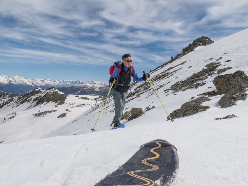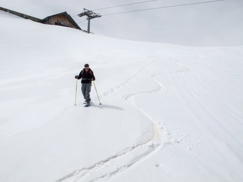 La neve è super trasformata per cui la discesa è stata una goduria, il sottoscrito con gli sci e Loredana con le racchette.