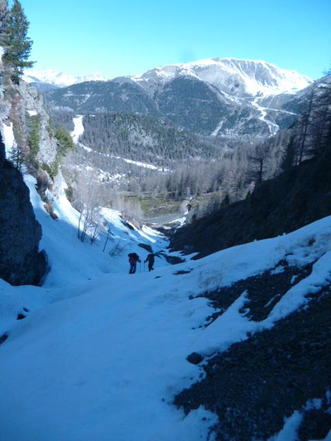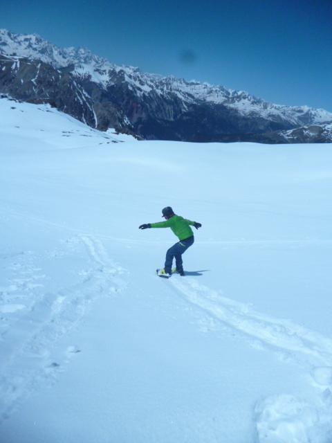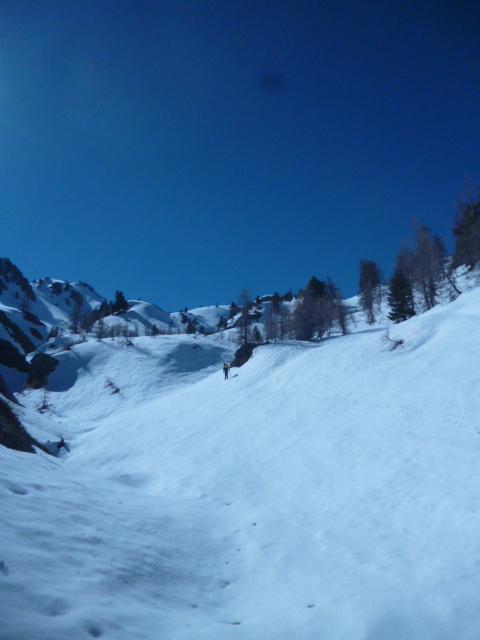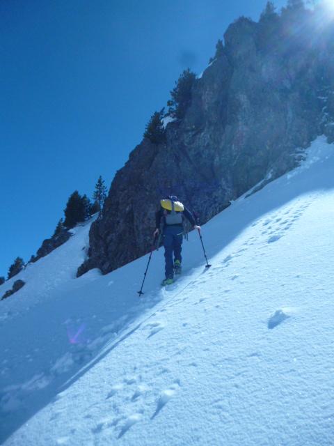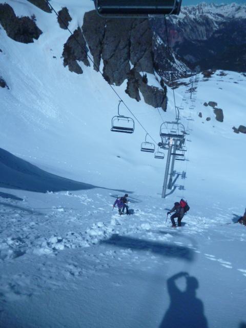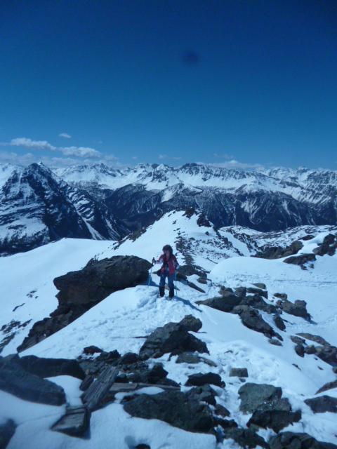 gita forse un po “tarda” per le ciaspole ma comunque soddisfacente; effettuate varianti al percorso: imboccato il bosco (indicazione, su palina di legno, sentiero per il Colletto Verde) anzichè risalire l’evidente pendio sulla sinistra (dx orografica) abbiamo imboccato il canale (orrido?)del torrente, ancora ricoperto da una spessa crosta di neve molto dura; (necessari i ramponi, picca a discrezione); la pendenza, mai eccessiva, è incrementale e variabile a seconda della conformazione dell’accumulo di neve; sbucati sul pianoro superiore lo abbiamo percorso sino all’inizio del pendio finale; anzichè risalire quest’ultimo abbiamo deviato a destra in direzione degli impianti di risalita alla ricerca di un nuovo canale percorribile; le condizioni della neve (presenza di cornici) e le pendenze, per noi, particolarmente impegnative ci hanno portato a risalire il meno poetico ma più sicuro (comunue impegnativo per quanto breve) canale, attraversato dalla seggiovia (ramponi indispensabili, picca a scelta); a questo punto si sbuca quasi sulle piste e si prosegue “a vista” verso l’arrivo della seggiovia, da lasciare alla propria sx per raggiungere il pendio finale; il pendio si prende effettuando prima una leggera diagonale verso dx, quindi (evidente) risalire tutto a sx; infine per facile cresta, oggi più che tracciata, si arriva alla vetta; alternativa al percorso delle ciaspole per chi ama far fatica con una facile variante semi (mini) alpinistica, con inevitabile disagio di metti e togli ciaspe e ramponi