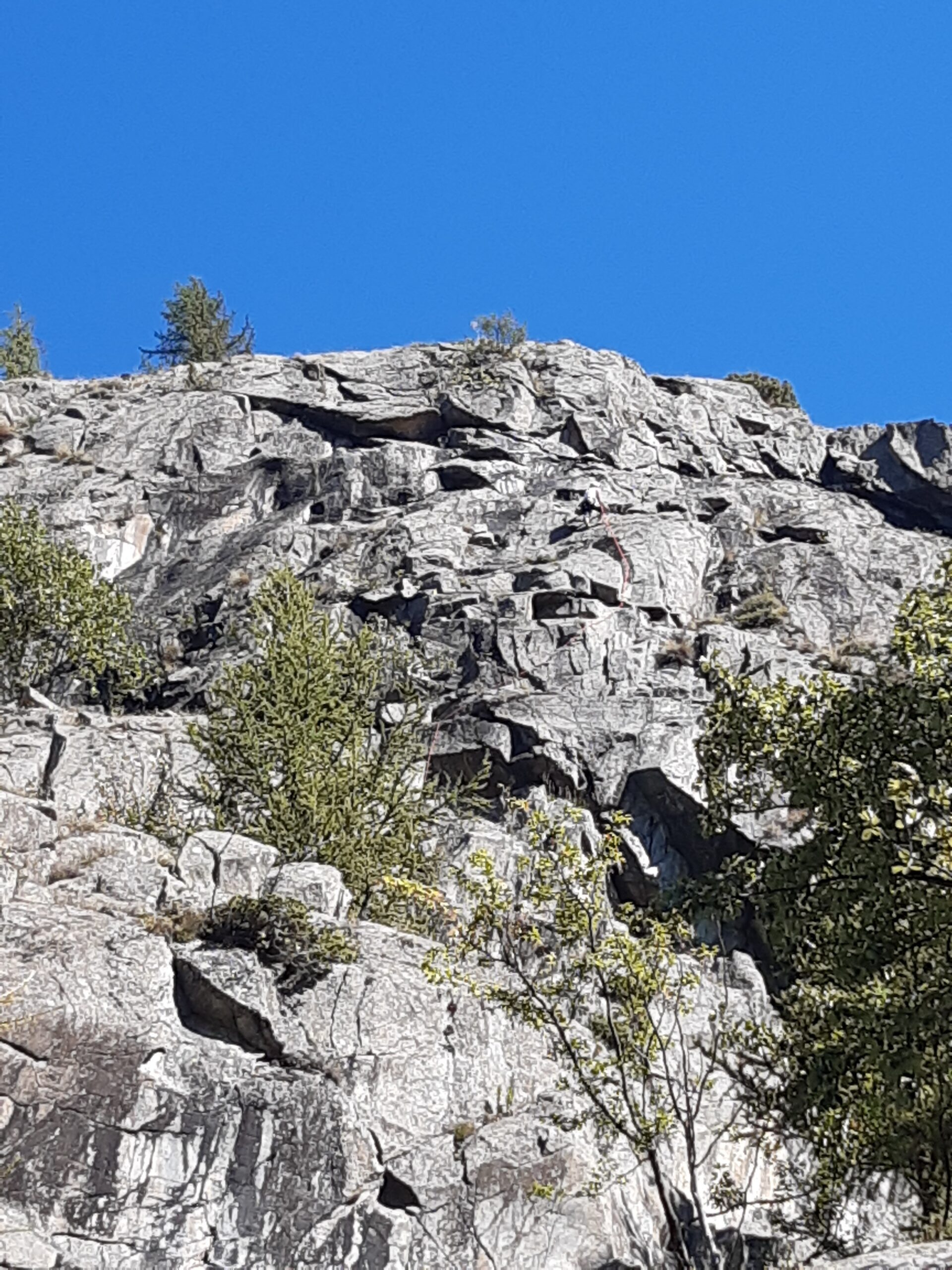 - L6 dritto su muretti (partenza del tiro un po’ a destra in alto) 60 m.