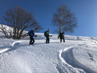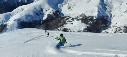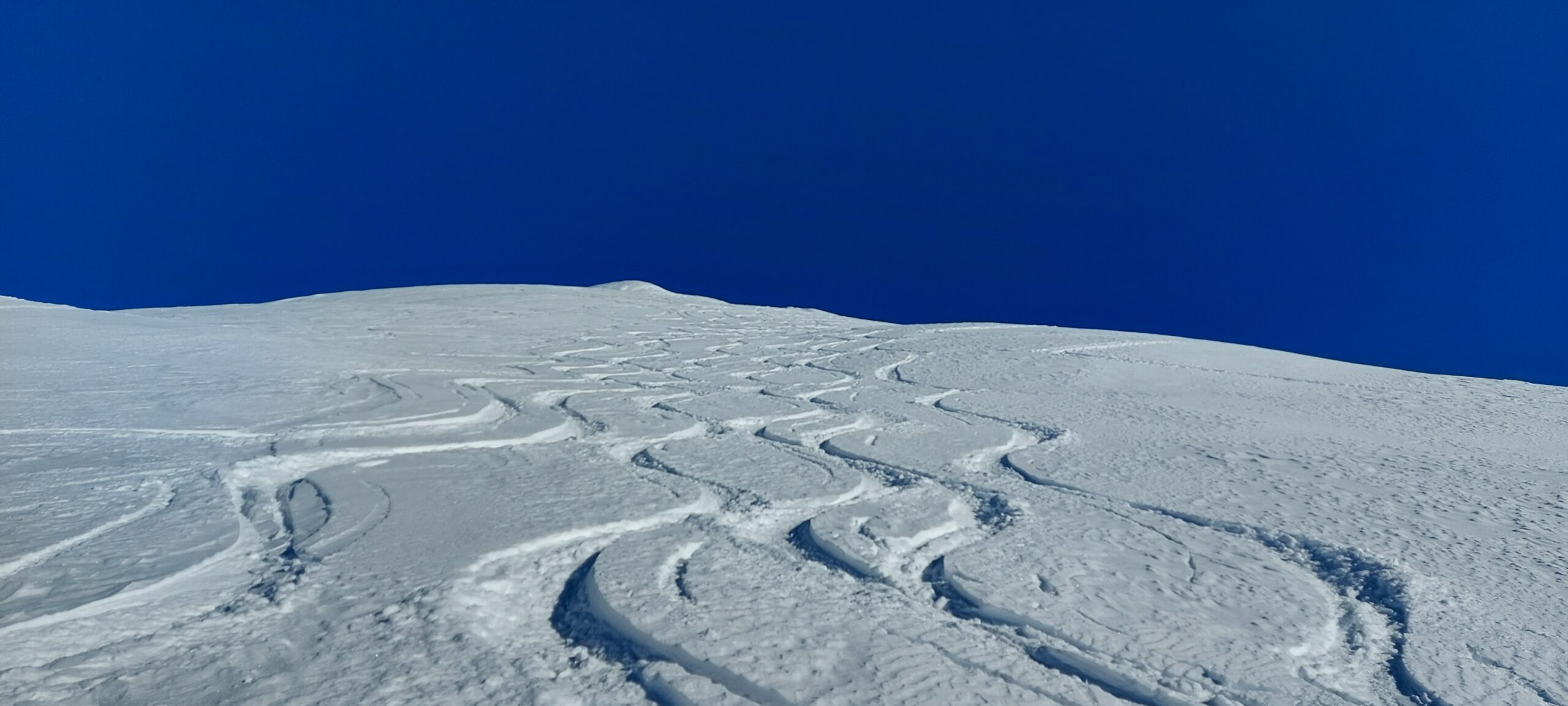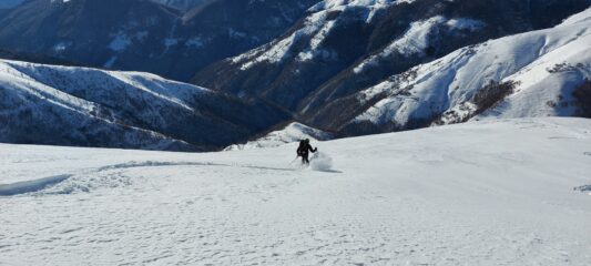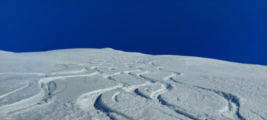 Anche oggi decidiamo di scendere un bel pendio ad Ovest tutto intonso, per poi rippellare e ritornare sulla traccia di discesa.