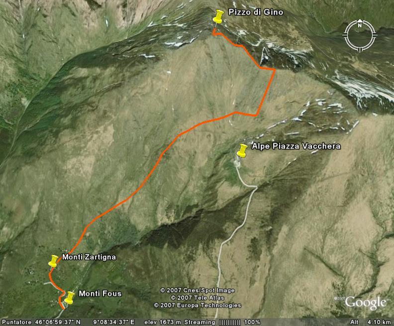 Sempre seguendo la sterrata, si guada un torrente ed elevandosi con un ultimo tratto in salita si raggiunge l’alpe di Piazza Vacchera, alpeggio ancora attivo a 1774 m ai piedi del Pizzo di Gino.