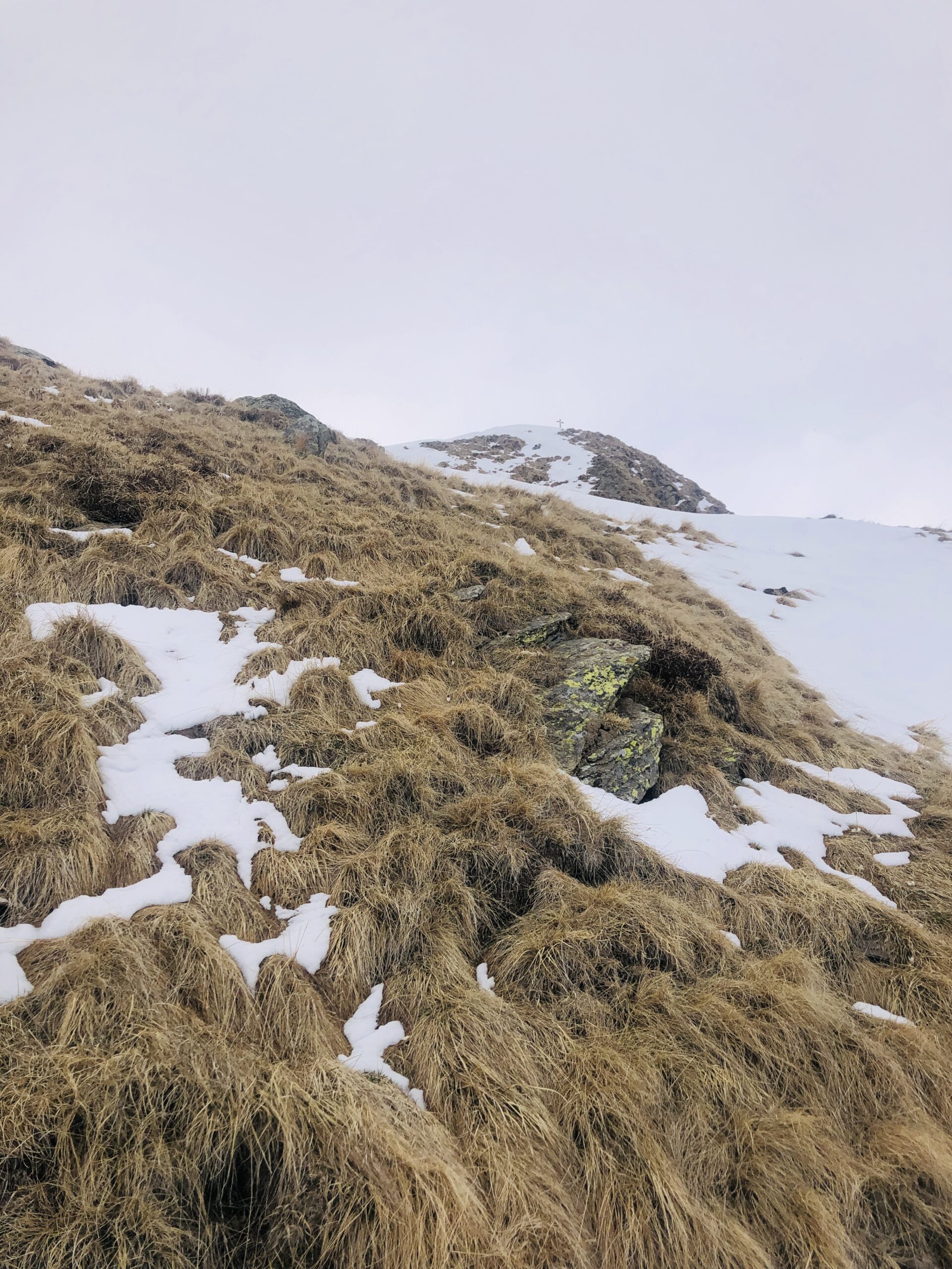 Si percorre la strada militare sino a un canalone in cui sono evidenti alcune vecchie trincee, risalire il canalone a mezza costa sfruttando delle tracce di sentiero sino a un grande ometto a quota 1980, da qui si sale l’erbosa e ampio crestone del pizzo di Gino in direzione est.