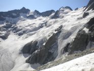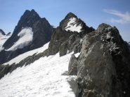Continuare a traversare di fianco, passando sotto lo sperone S della cresta N.E fino a raggiungere un dosso morenico dove inizia il Glacier du Gioberney. Salire il ghiacciaio tenendosi sotto la cresta NE e contornando a sin. un isolotto roccioso fino a raggiungere per pendio un po’ più ripido i nevati superiori. Traversando verso sin. raggiungere il Col du Gioberney (m 3238). Dal colle seguire la cresta aggirandone i primi piccoli salti per facili cengie del versante O per poi riprenderla e seguirla facilmente fino in vetta (ore 2,30 dal rifugio).