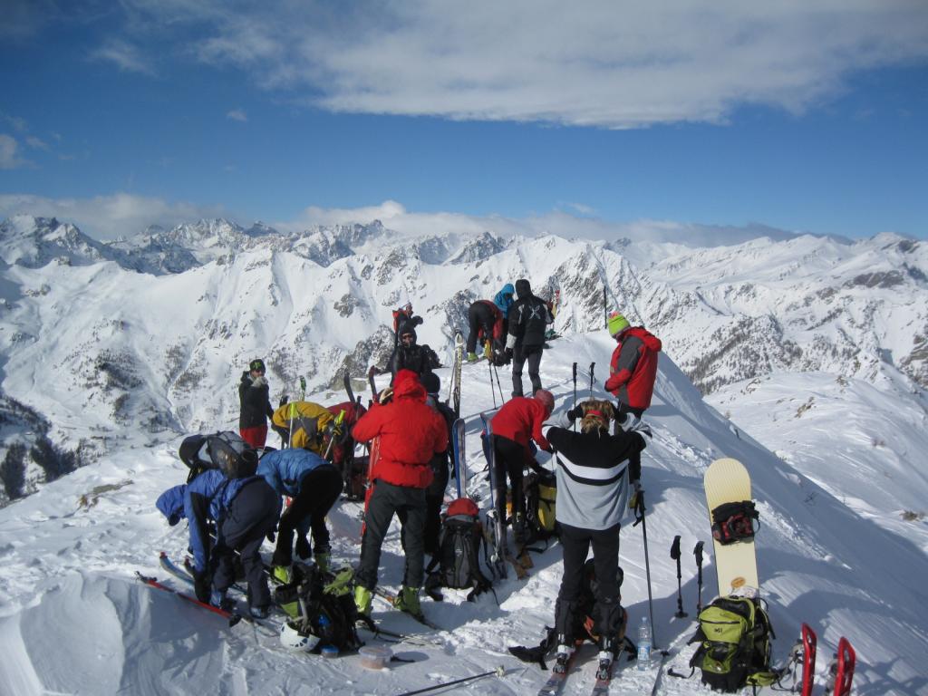 Saliti all’anticima.Una spanna di polvere di ieri che in alto è stata spazzata via,primi 100mt super ventata poi via via meglio.Tratti di crosta
