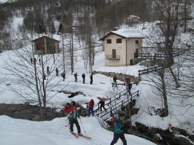 Prima giornata della gita sociale di 2 giorni in Val Maira del CAI Pianezza, 27 partecipanti. Viste le recenti nevicate e le previsioni meteo abbiamo scelto una gita soft. Partenza intorno alle 8.45 dal Preit. La strada dal parcheggio fino alla centrale è sgombra di neve ma stando sul lato si può salire sci ai piedi. In salita abbiamo seguito una traccia che però sopra le baite si tiene troppo a sinistra e termina ad un colletto a quota 2.300 m circa. Poco sotto questo colletto si potrebbe raggiungere l’anticima con un lungo traverso ascendente verso destra, che però con le attuali condizioni abbiamo valutato non sicuro, e quindi ci siamo fermati anche perché nel frattempo il meteo è peggiorato e si è messo a nevicare copiosamente. Discesa iniziata intorno alle 11.30 su bella farina solo un po’ pesante fino a quota 2.000 circa, peccato solo per la scarsa visibilità che rendeva tutto uniforme. Qui, vedendo le condizioni della neve in alto e considerando che l’ora lo consentiva, buona parte del gruppo ha deciso di ripellare, mentre gli altri sono scesi. Siamo quindi saliti in direzione dell’anticima; anche stavolta però ci siamo dovuti fermare 10 metri dall’anticima stessa in quanto non ci siamo fidati di un brevissimo traverso di pochi metri che però sembrava piuttosto carico…peccato perché poi da qui arrivare in cima seguendo la dorsale era un attimo…