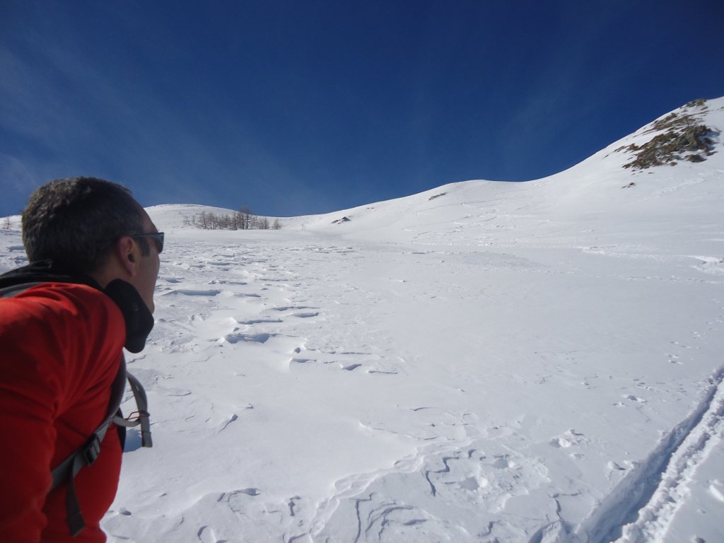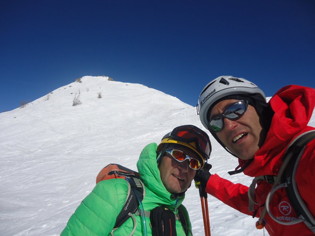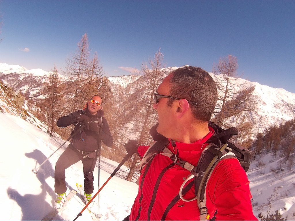 Piazzale già abbastanza affollato alla partenza con altri skialper giunti ancora dopo di noi. Quasi tutti con medesima destinazione. Processione lenta in salita che appena possibile abbiamo superato. Buona traccia dalle Grange in sù su neve portante ventata. Ultimo tratto prima della vetta fatto a piedi. Vento incessante costante per buona parte della gita. Discesi dapprima sul lato Marmora su versanti ancora intonsi su neve primaverile abbastanza dura che man mano che si scendeva si ammorbidiva dove abbiamo messo le nostre firme. Fermati a circa 2050 mt. di quota da dove abbiamo ripellatto in direzione del colletto sottostante la vetta. Battuto traccia per circa metà percorso da dove poi abbiamo sfruttato la traccia fatta da due skialper tedeschi che avendoci visto scendere ci hanno imitato per una parte di discesa. Vento fastidioso ancora presente che ci ha accompagnato anche per la discesa lato Preit sino al pianoro sopra le Grange. Prima parte discesa su neve molto ventata con croste moderatamente portanti, poi sino al limite del bosco su neve portante abbastanza dura e comunque con discreta sciabilità nonostante i numerosi passaggi preesistenti. Ultima parte della discesa su neve primaverile morbida e divertente quasi pistata dai passaggi. Occhio solo alle pietre affioranti. Si parte e arriva ancora al parcheggio sfruttando le tracce a bordo strada sul lato sinistro orografico con il solo attraversamento della provinciale poco prima del piazzale. Per la prima discesa da intendersi almeno mezzo stella in più. Sosta rifocillatrice all’ Ape Maira.