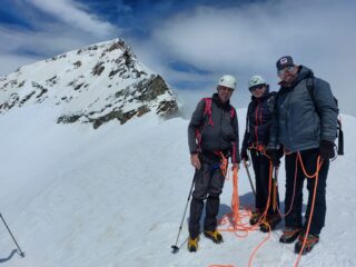 Saliti nella finestra di bel tempo prevista fino alle 11, previsione poi sostanzialmente confermata dai fatti. Il ghiacciaio era tutto ben coperto di neve, compresa quella scesa nella notte, e non vi erano crepacci visibili. Il manto nevoso risultava portante durante la salita, (9-11 circa), mentre in discesa (12-13) aveva già mollato e certi sfondamenti erano inevitabili, specialmente fino verso i 3500 metri. Ma l’itinerario è breve e l’inconveniente si può tollerare.