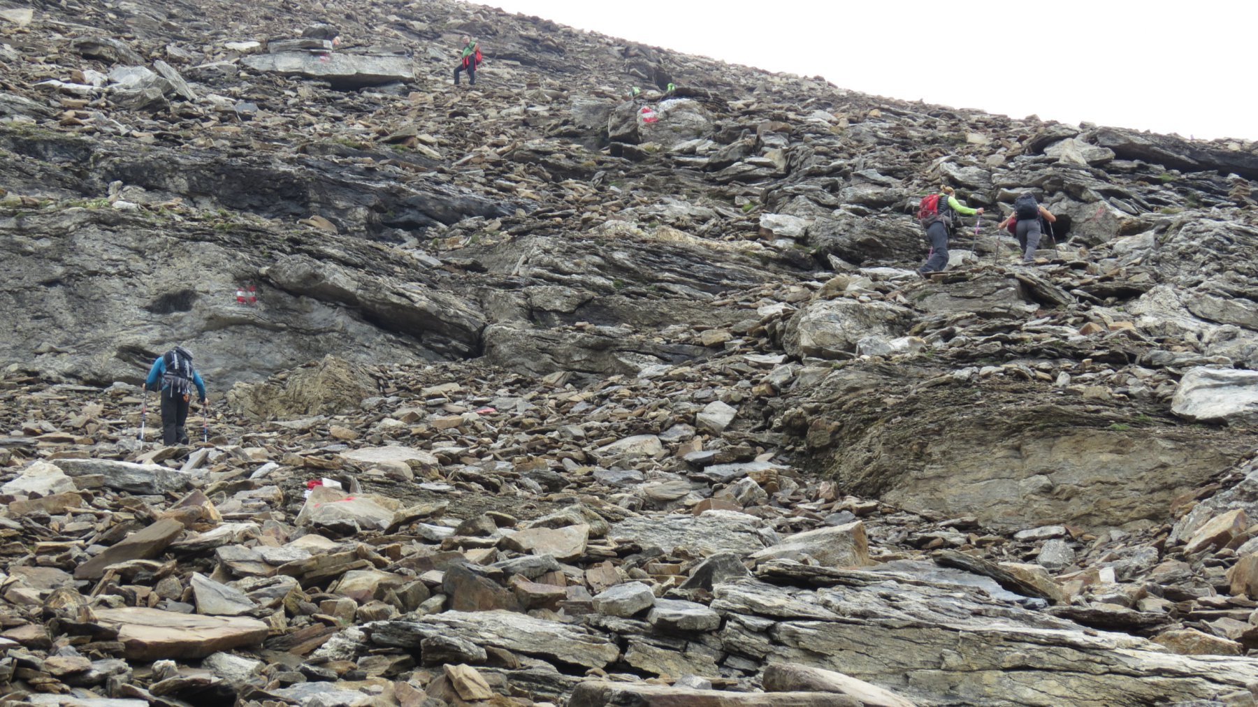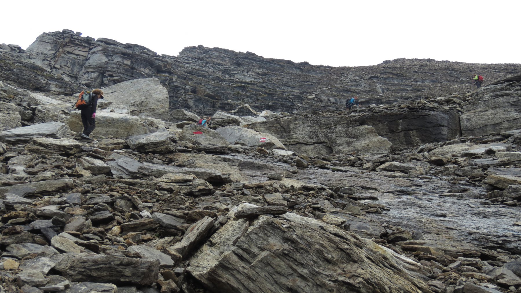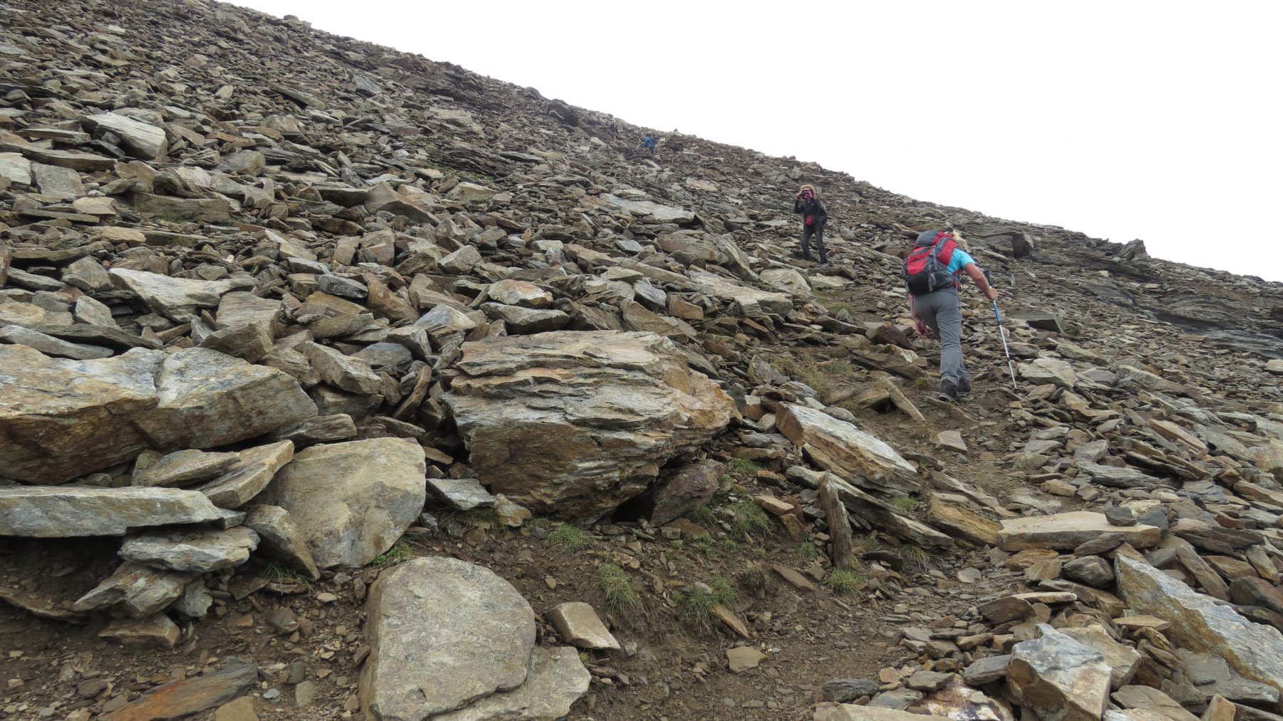 Si attraversa la pietraia cercando la via migliore e quindi si inizia ad affrontare il ripido pendio finale di detriti e rocce rotte, facendosi guidare da un buon sentiero, che seppur ripido, permette di camminare sempre agevolmente nonostante la pendenza del terreno.