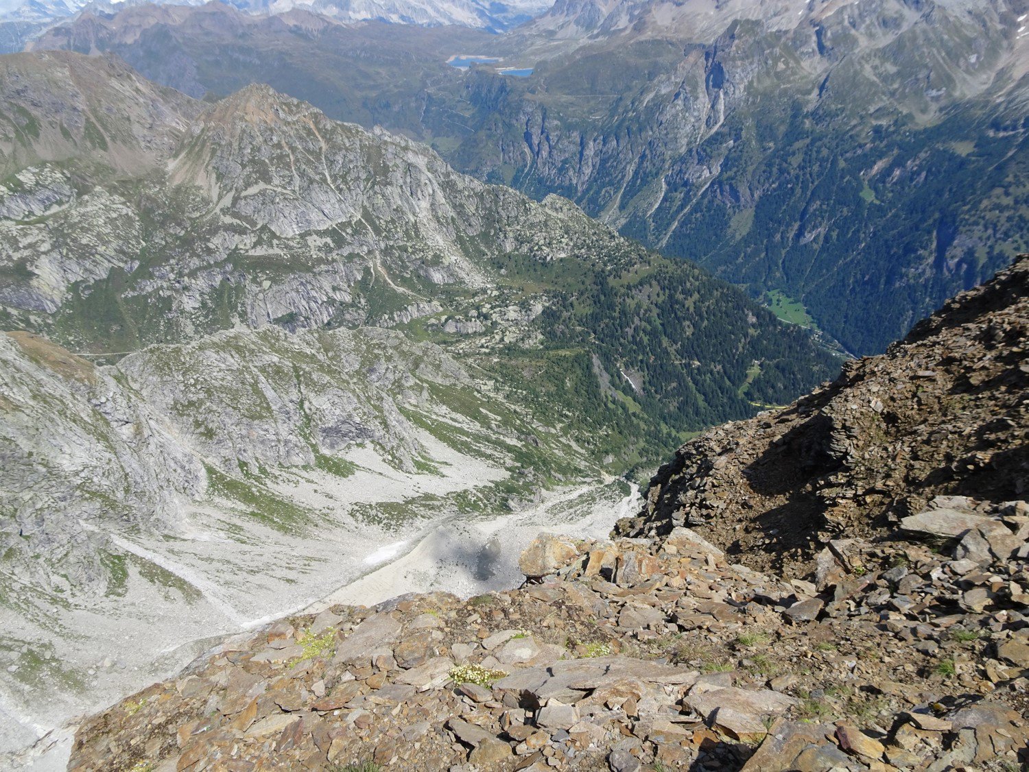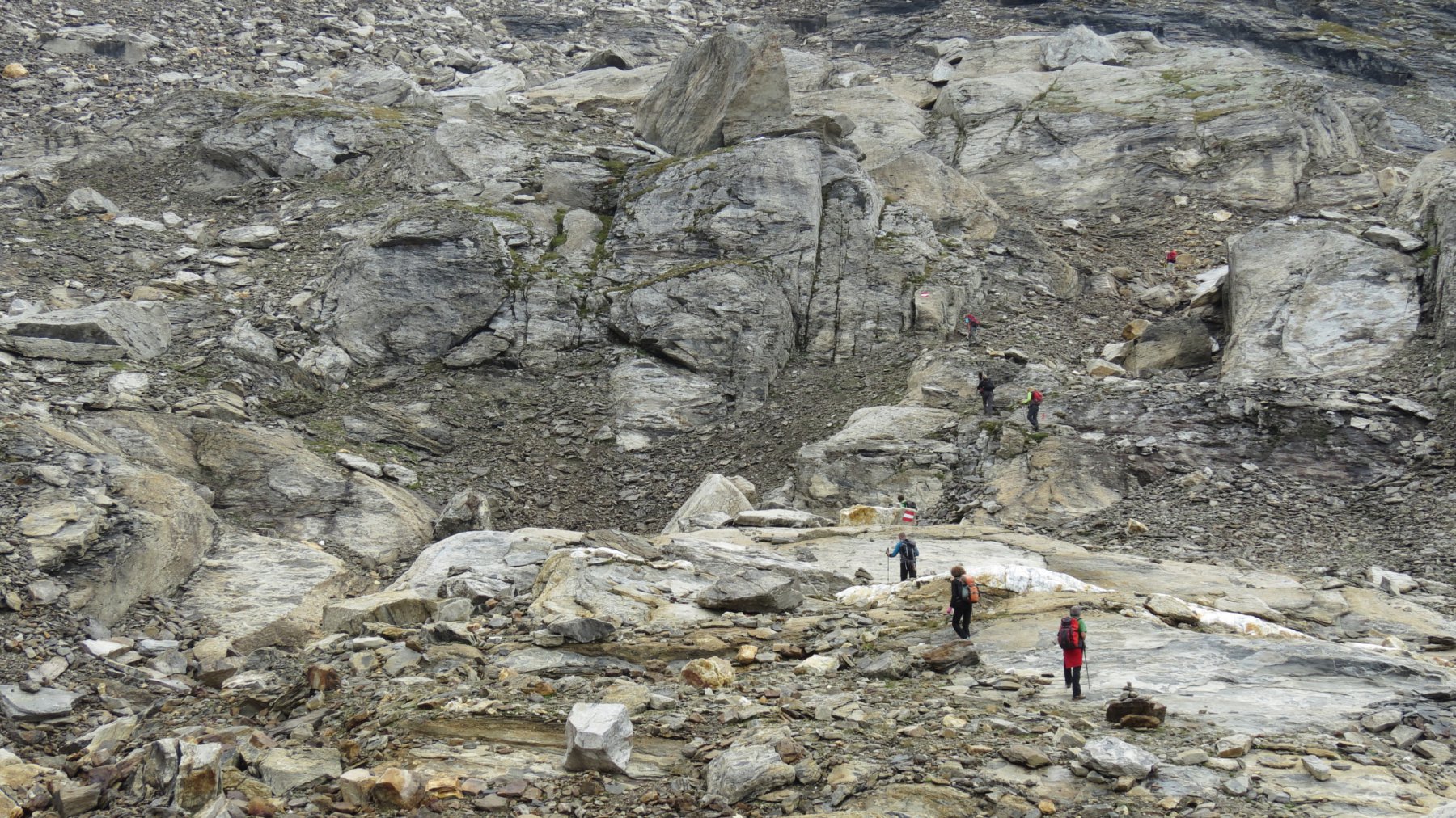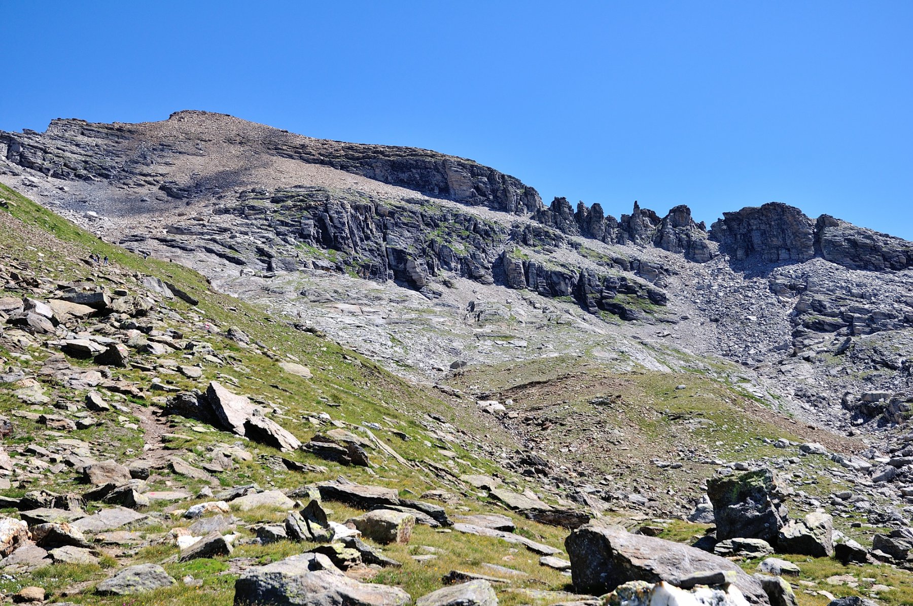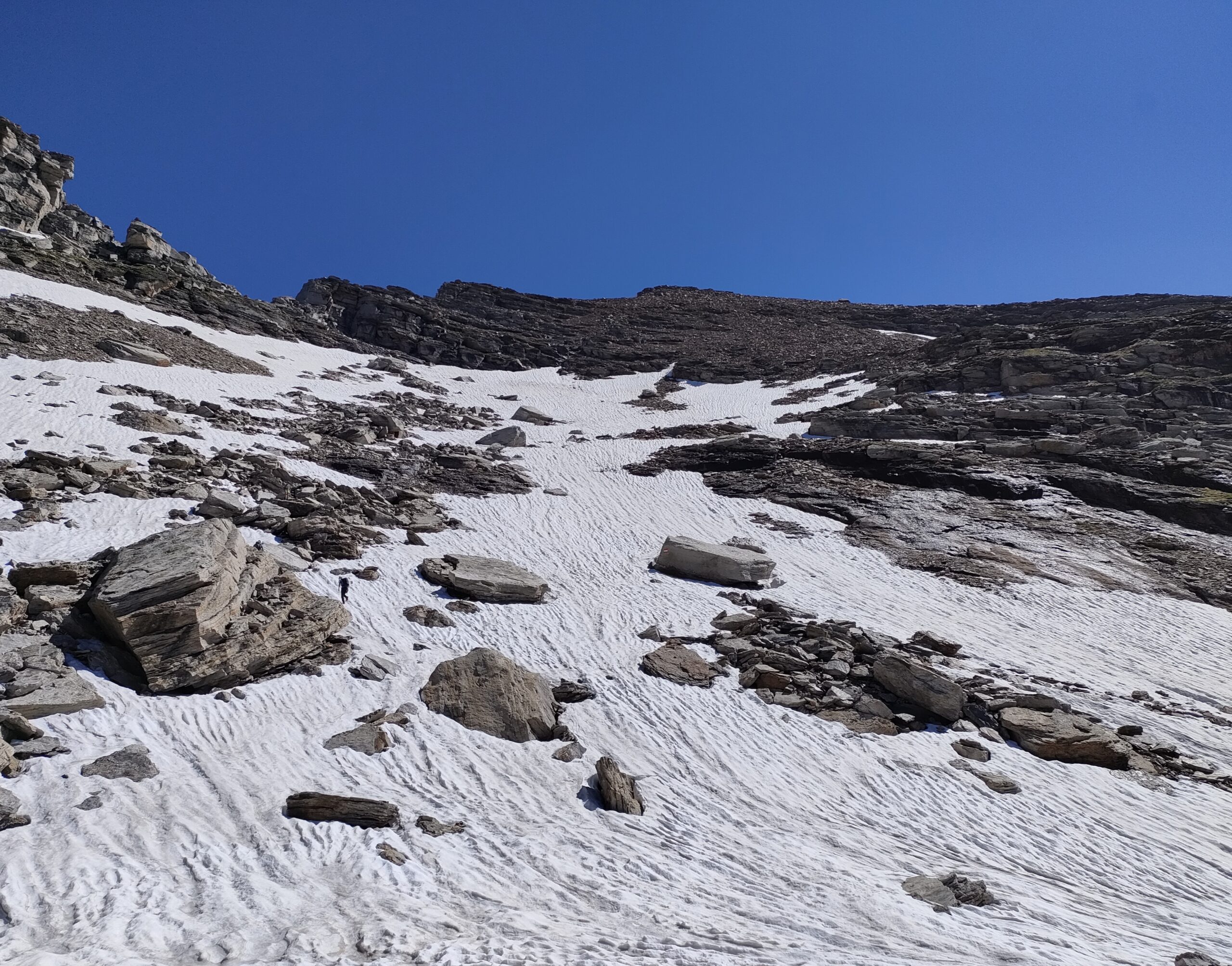 Si attraversa la pietraia cercando la via migliore e quindi si inizia ad affrontare il ripido pendio finale di detriti e rocce rotte, facendosi guidare da un buon sentiero, che seppur ripido, permette di camminare sempre agevolmente nonostante la pendenza del terreno.