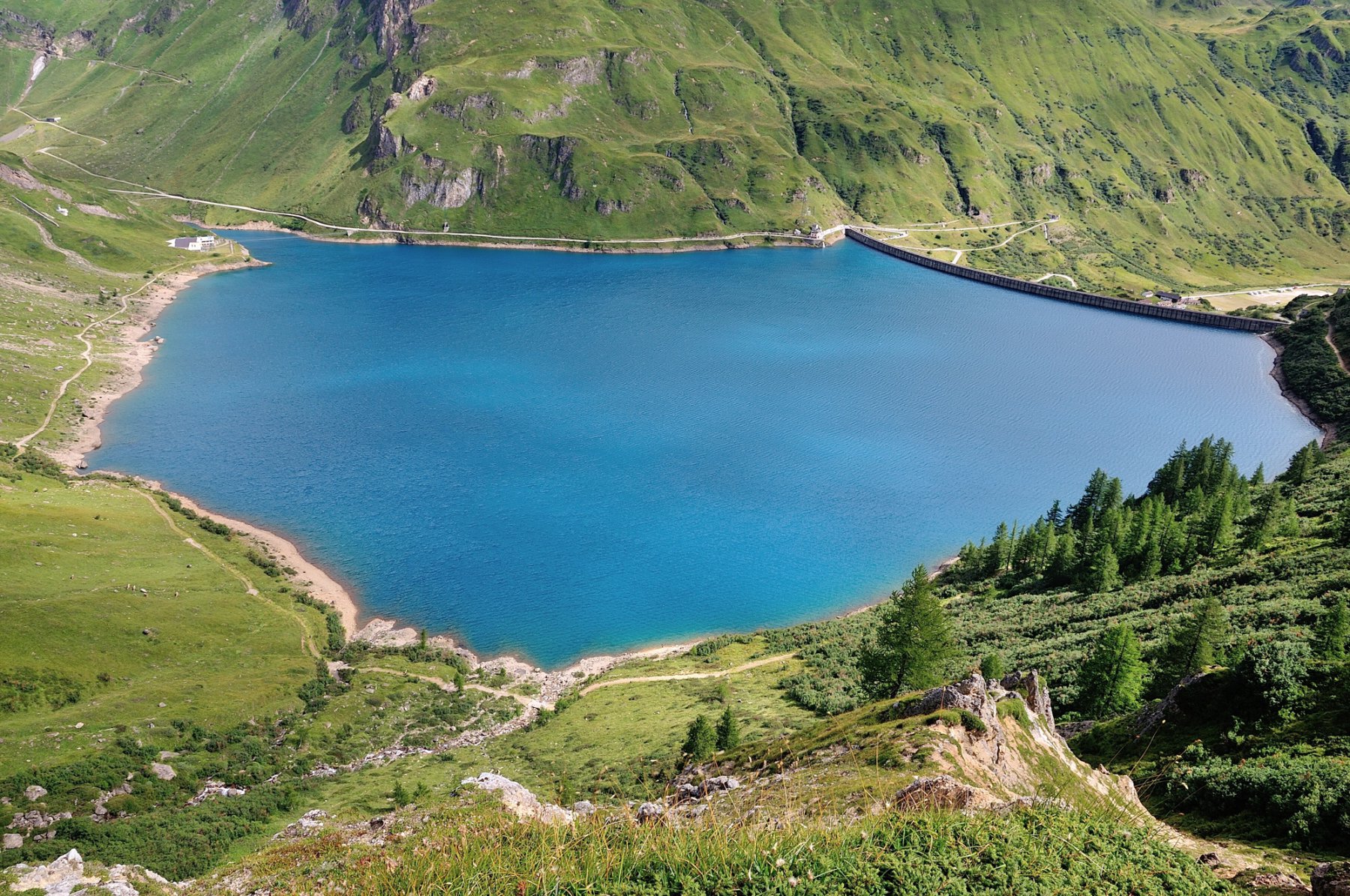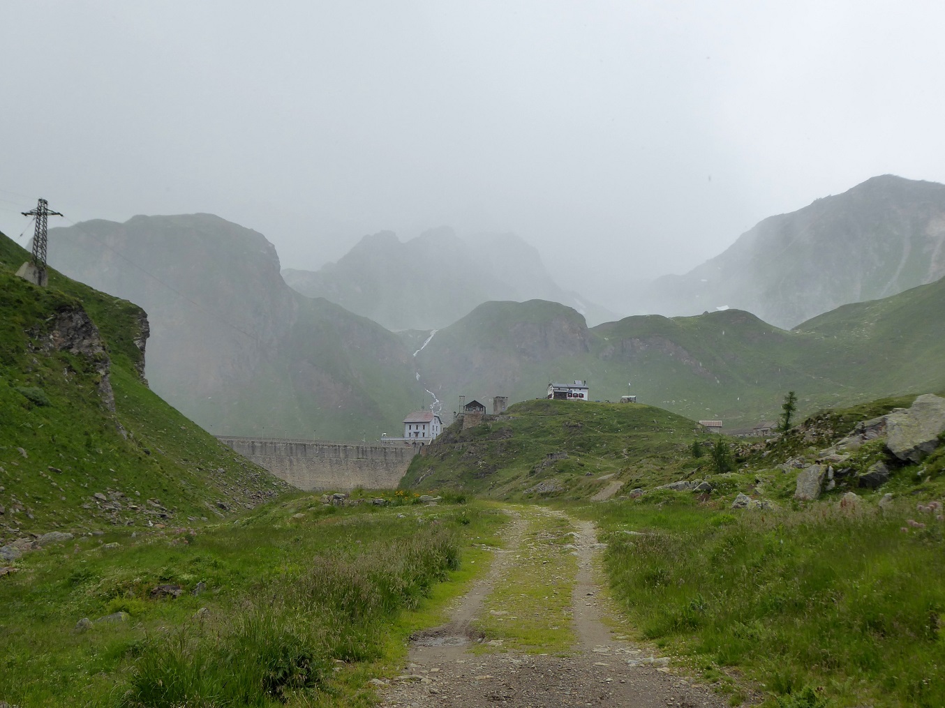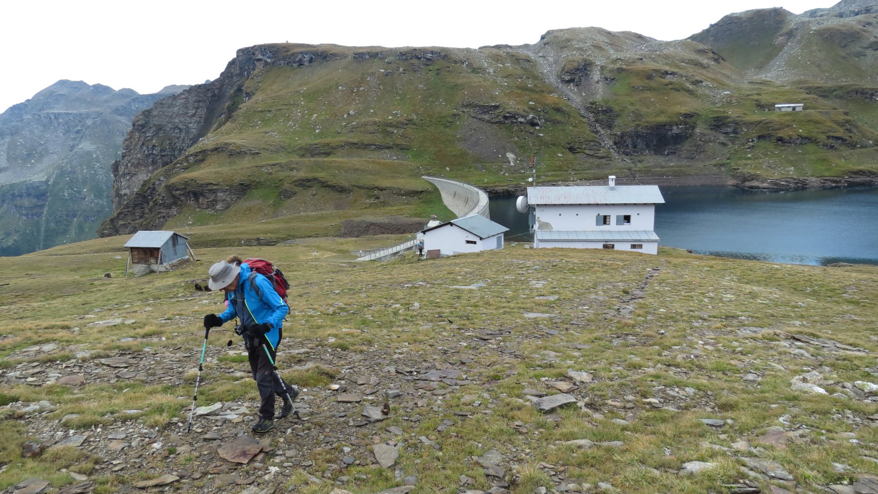 Si raggiungono i fabbricati dei guardiani della diga, e qui si piega nettamente a sinistra, iniziando una salita per i dossi erbosi, seguendo tracce di sentiero in direzione nord, puntando all’evidente pendio del Monte Giove.