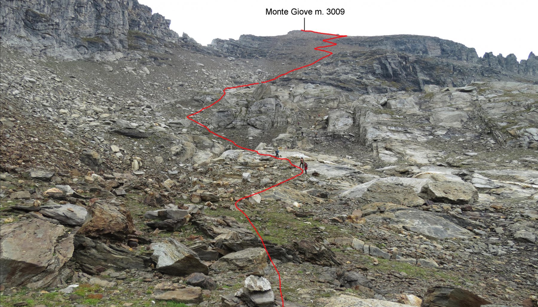 Come riferimento si dovrà passare non lontani dalla cresta che separa i due valloni. Terminati i dossi erbosi si raggiunge una conca dove si trova una pietraia di grossi blocchi, qui si rendono utili come riferimento le tacche di vernice bianco/rosse che guideranno fino in cima.