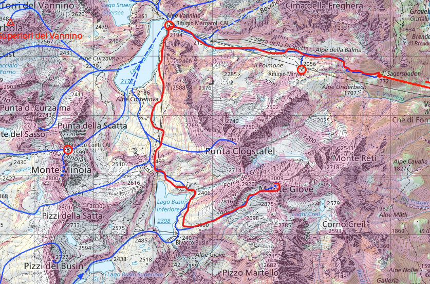 Il dislivello complessivo tiene conto di alcune perdite di quota, in particolare quella che dal Passo del Busin Inferiore scende all'omonimo lago, discesa di circa 100 m, che poi al ritorno andranno risaliti.