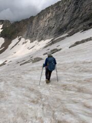 Questa estate vede pendii ancora carichi di nevai, su consiglio del rifugista del Margaroli, avevamo i ramponi che sono stati indispensabili. Passo del Busin libero da neve ma subito dopo sono numerosi. Il sentiero dopo la casa dei custodi é segnatissimo prima con ometti e paline, nel formale sotto il Giove calzato i ramponi e cercato la via più comoda, 150 metri sotto la vetta (libera da nevai) si procede sul ripido sentiero guidati dai segnavia bianco/rosso.