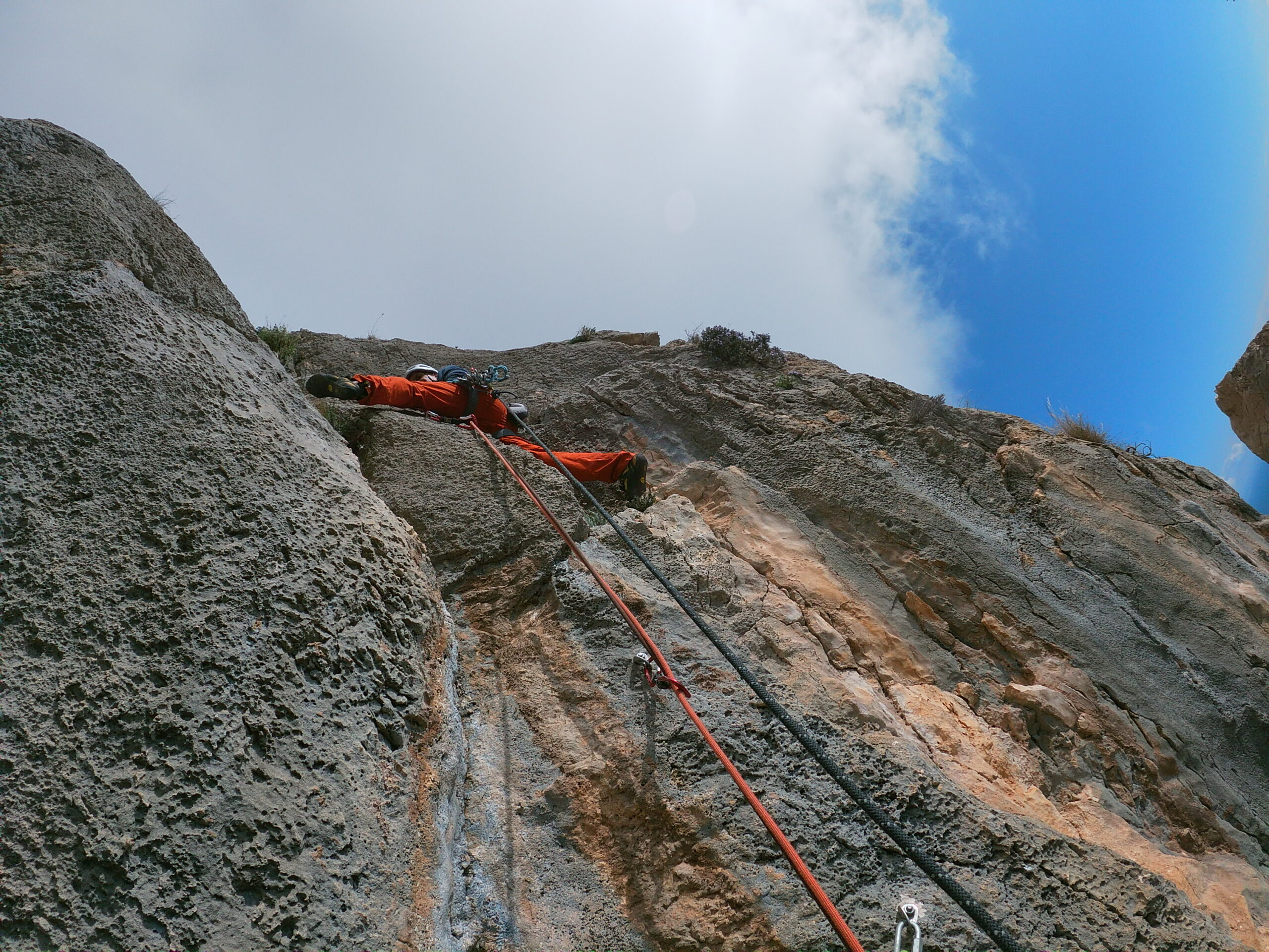 - 3 TIRO 7a+ / A0 – 25mt : Dopo un primo tratto di circa 5mt facile, il tiro si fa molto più impegnativo, con una prima sezione su roccia verticale a piccole concrezioni sul rosso, per poi impennarsi e diventare leggermente strapiombante su roccia grigia. In uscita dallo strapiombo, una volta risaliti su un bell’appoggio per i piedi si riesce a raggiungere la sosta con facili passaggi.