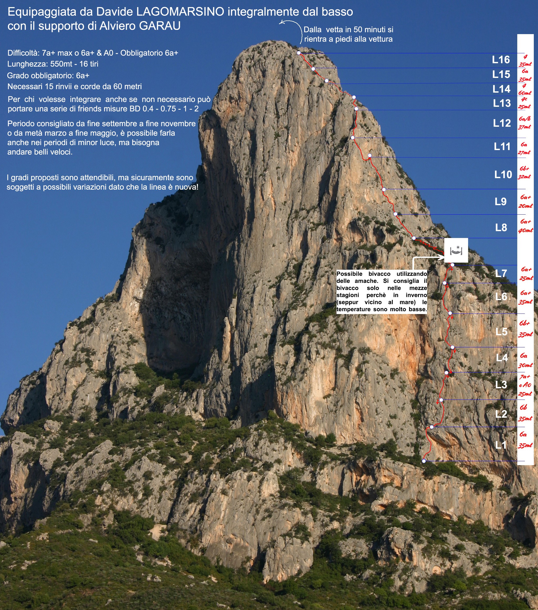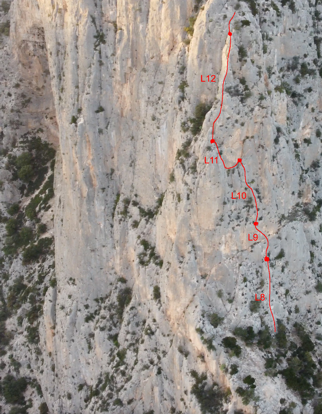 Dalla sosta di L7 uscire in cengia. Dritti sora l’uscita della via leggermente a destra troverete una traccia che per omini vi condurrà all’attacco della seconda parte, nome della via alla base del tiro 8. (Bivacco possibile per chi non vuol correre sulla via ma desidera godersi la salita suddividendola in due giornate. Una vista spettacolare sulla costa sottostante e su Pedralonga, non annoieranno le ore rimanenti da passare lì prima della notte. La sera il suo porto di Arbatax regalerà un effetto notturno di luci spettacolare).