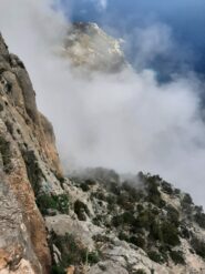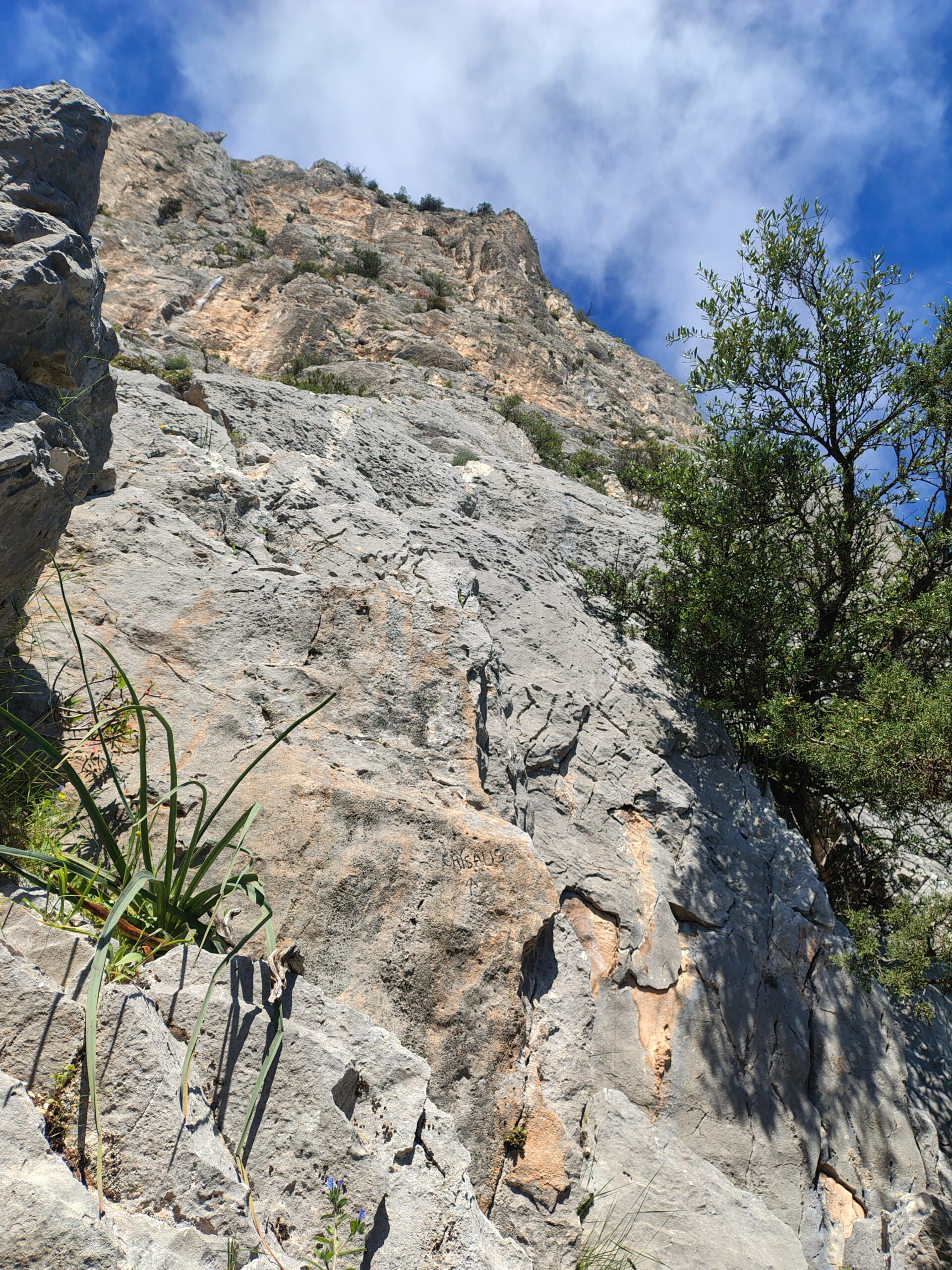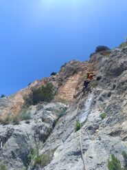 - 7 TIRO 6a – 25mt : Dalla sosta risalire dei risalti prima verticali poi abbattuti fino alla base di un muro grigio liscio. Vincerlo risalendo su splendide concrezioni marroni formatesi sul muro fin sotto un albero. A questo punto con traverso delicato a destra risalire fino alla sosta con catena che termina sulla cengia mediana di Punta Giradili. (Nonostante abbiamo pulito molto la base della cengia, prestare attenzione alle pietre soprattutto se ci fossero cordate sotto di voi).