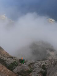 - 14 TIRO 4 – 60mt : Salire per tratti di terzo in verticale fino una terrazza, piegare a destra aggirando il pilastro che incontrerete e successivamente seguire sempre il filo della cresta. Qualche spit messo giusto per non perdersi. Raggiungere in una nicchia protetta la sosta con due spit e cordone alla base di un canale di rocce compatte. Tiro facile scalabile anche con gli scarponcini per far riposare un poco i piedi.