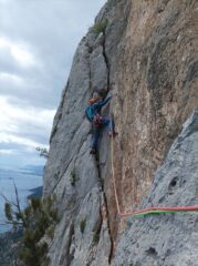Tiro elegante sempre su ottima roccia - 9 TIRO 6a – 20mt : Dalla sosta proseguire per circa 4/5mt sulla placca verticalmente e poi piegare a destra su diedro, risalirlo fino alla fine e poi tendere decisamente a sinistra sotto un piccolo muro bombato. Affrontarlo direttamente e ristabilirsi continuando a traversare sempre verso sinistra. Arrivati ad una fessura obliqua molto grande riprendere a salire verticalmente fino alla sosta scomoda ed aerea. Sulla destra della sosta è stato piazzato un’ulteriore spit con anello per agganciare zaini o sistemare le corde recuperate. Tiro tecnico che richiede astuzia per non renderlo più difficile del grado dichiarato.