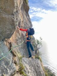 Foto al secondo di cordata da cartolina garantite da un ambiente esageratamente bello - 13 TIRO 4 – 20mt : Dalla sosta salire verticalmente seguendo una placca molto abbattuta super lavorata dall’acqua. Piegare a destra fino alla base di un muretto verticale breve ottimamente appigliato che conduce alla comoda sosta.