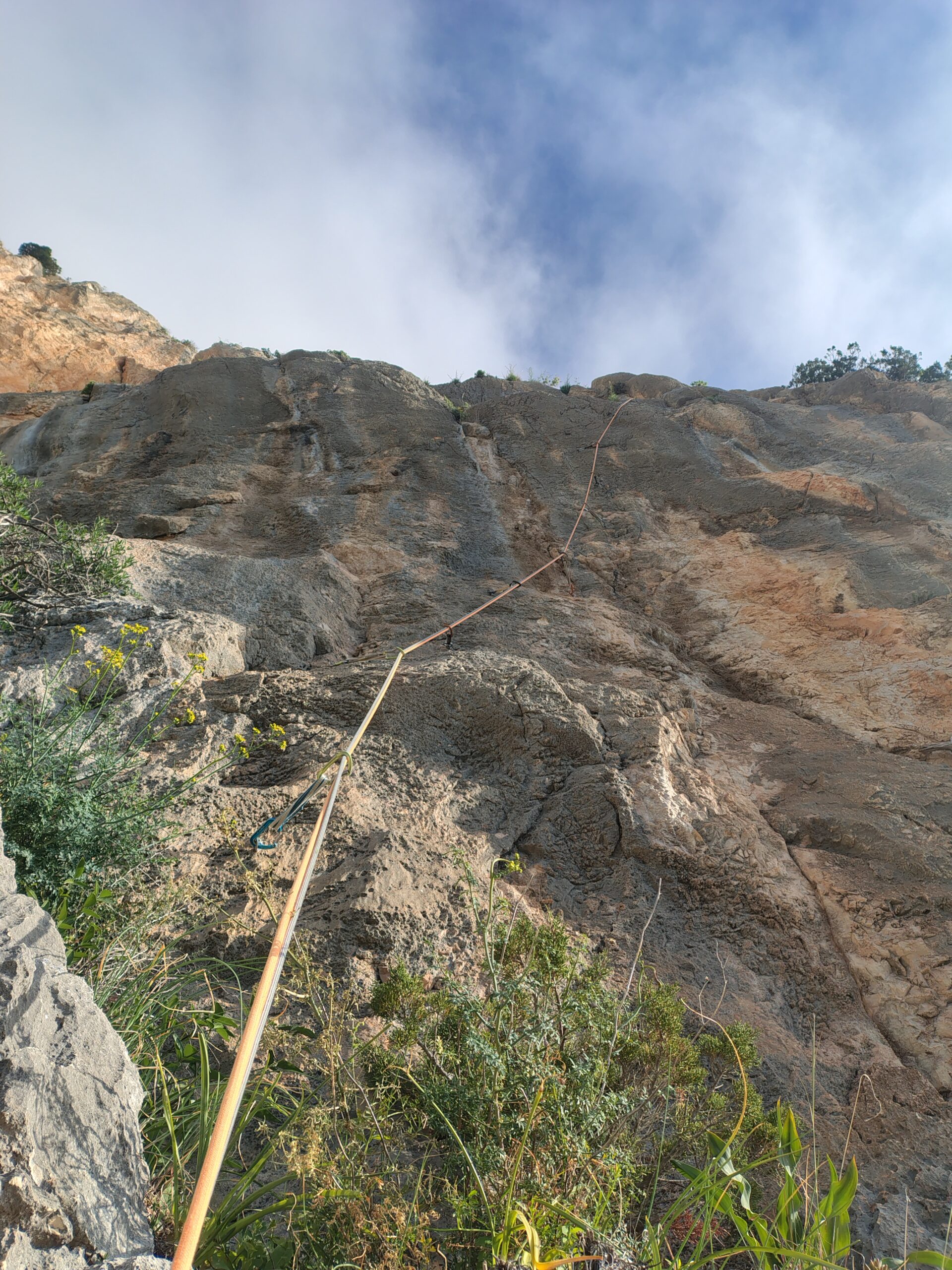 Sotto gli strapiombi due spit con anello di calata permettono di sostare comodamente. - 2 TIRO 6b – 35mt : Dalla sosta effettuare un traverso tecnico di circa 8mt spettacolare con il mare sullo sfondo, dopodichè il tiro comincia a salire un muretto verticale che successivamente diventa placca lavorata meravigliosamente. Salire la placca fini ad arrivare a un piccolo terrazzino vicino a una pianta dove si trova la sosta con catena. Tiro divertente tutto da scalare.