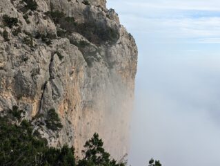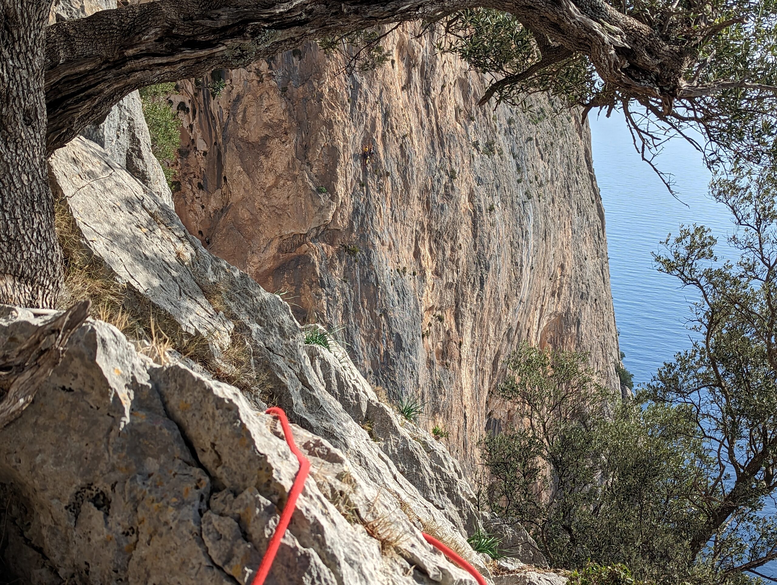 Bello il primo tiro. il secondo richiede decisione, il terzo tignosetto. Il quarto una passeggiata panoramica sulla cengia sospesa. Il quinto breve. Il sesto bello, lungo e tiroso (se non si allungano i rinvii . Il sesto facile per uscire