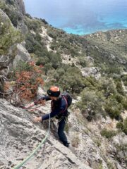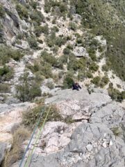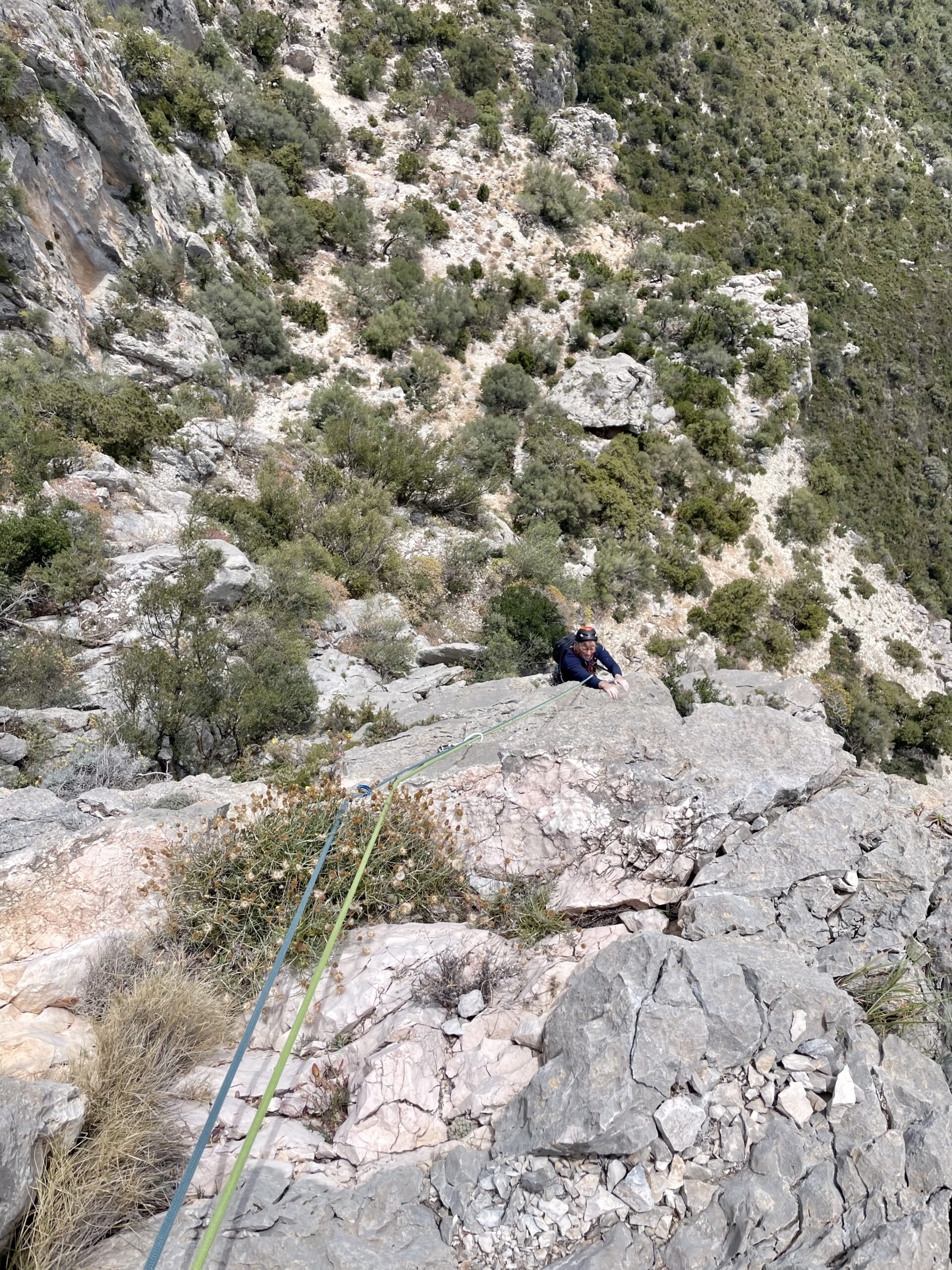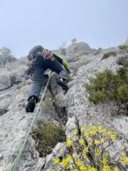 Via molto bella, su roccia da favola. Alcuni tiri sono eccezionali. Il penultimo tiro, anche allungando i rinvii, tira da morire, molto meglio se si prova a spezzarlo a meta’ con sosta su delle protezioni mobili. Chiodatura da S2, possibile integrare poche volte con friend piccoli. Rimesso in piedi una decina di ometti dall’uscita in poi.