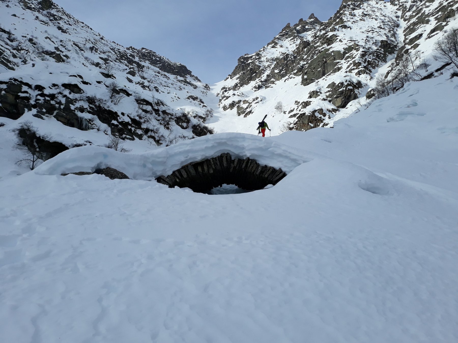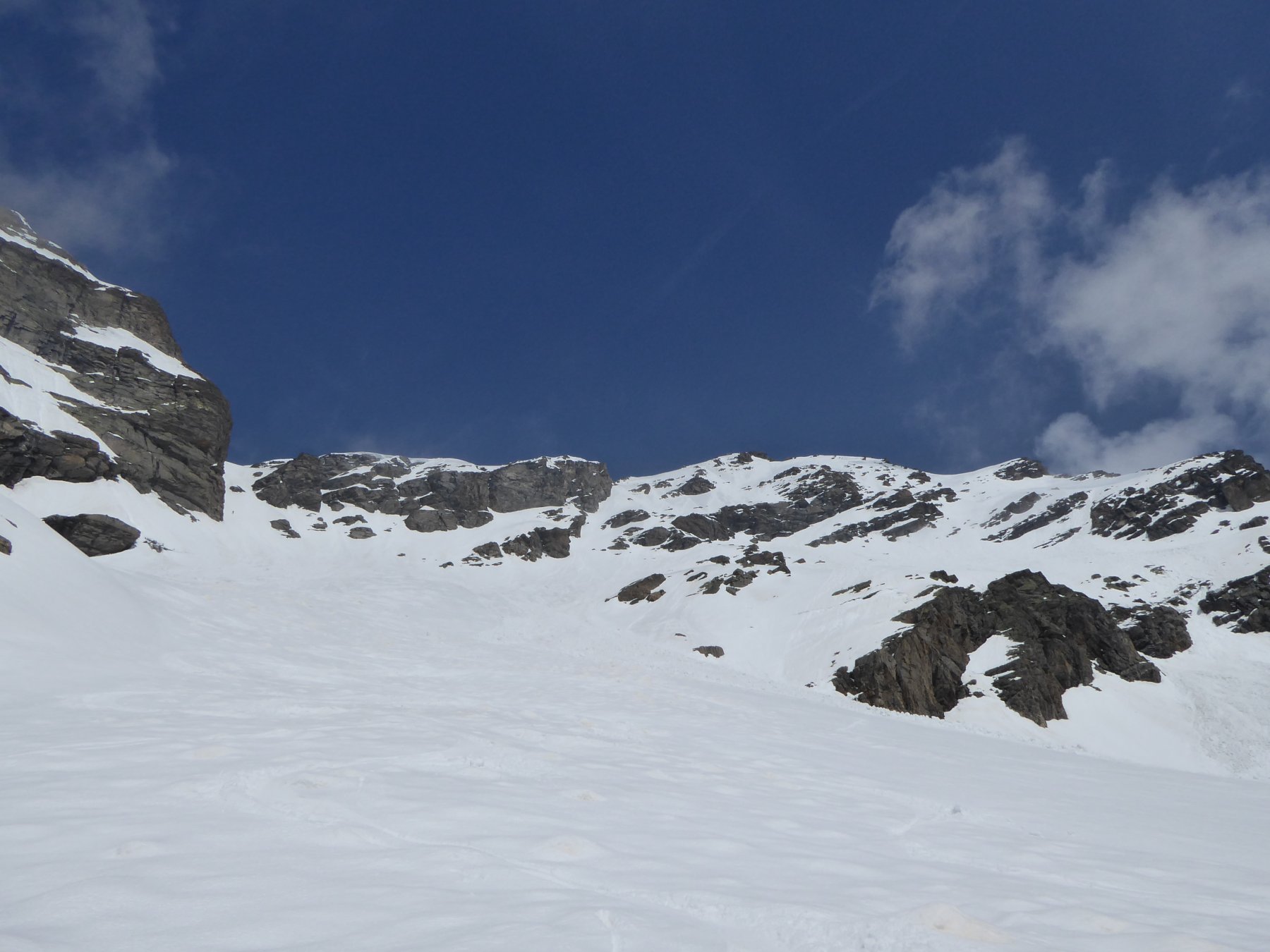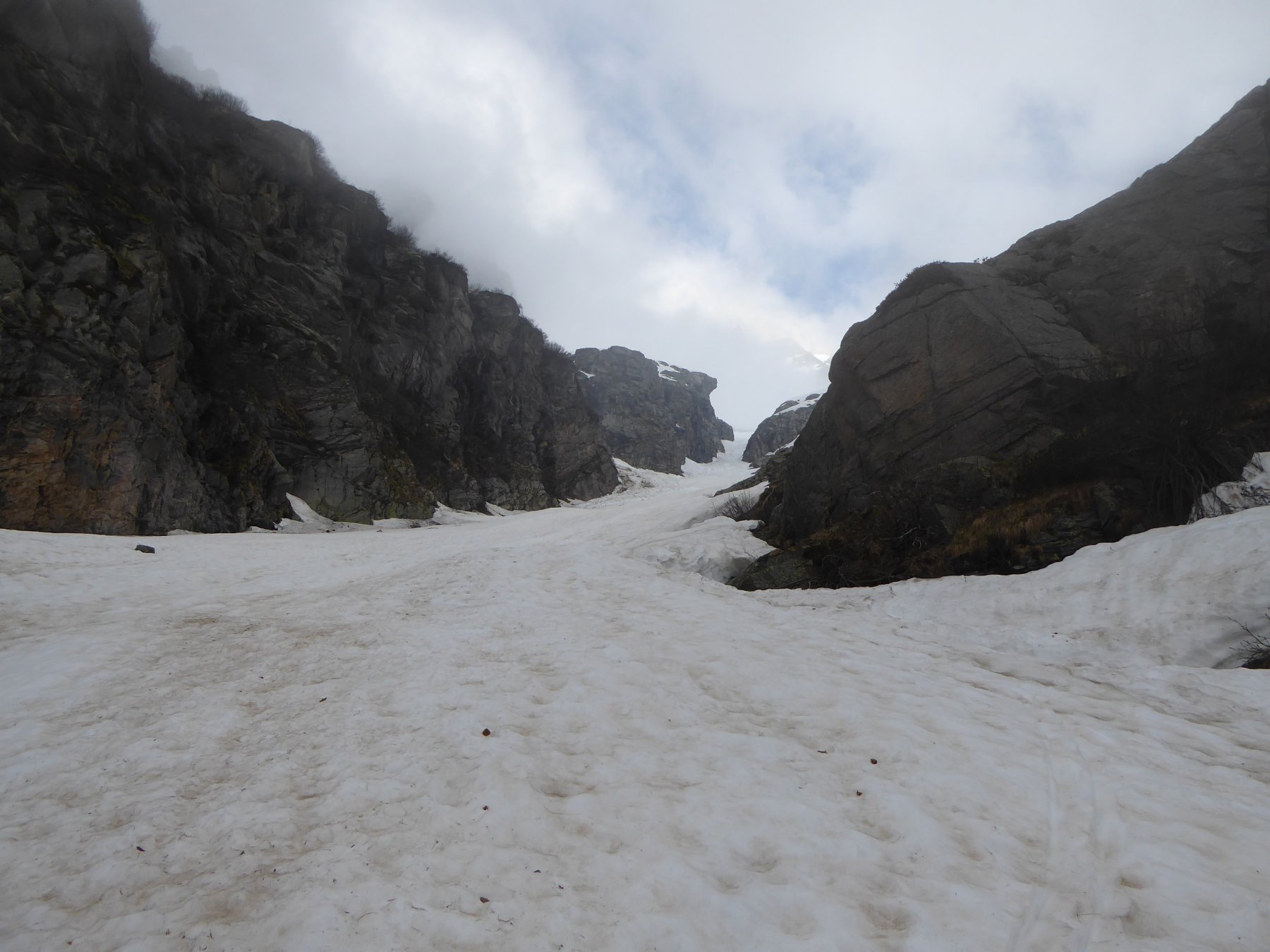 Qui si calzano gli sci seguendo l’evidente canalone di fronte e che passa sotto alle bastionate rocciose solcate da cascate (non conviene seguire l’itinerario estivo sui pendii a destra).
