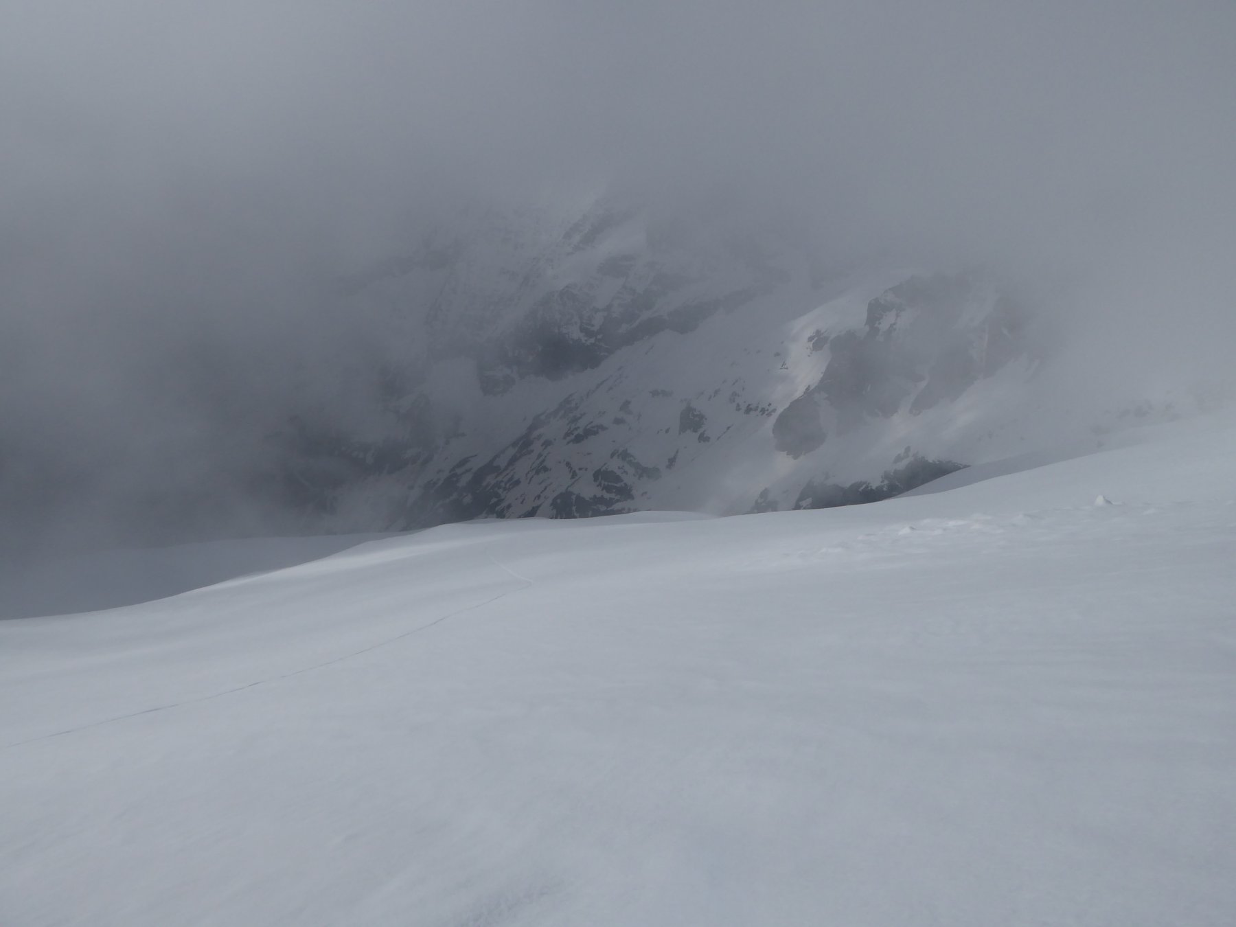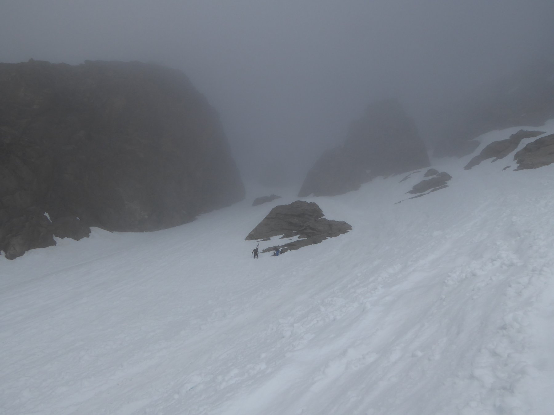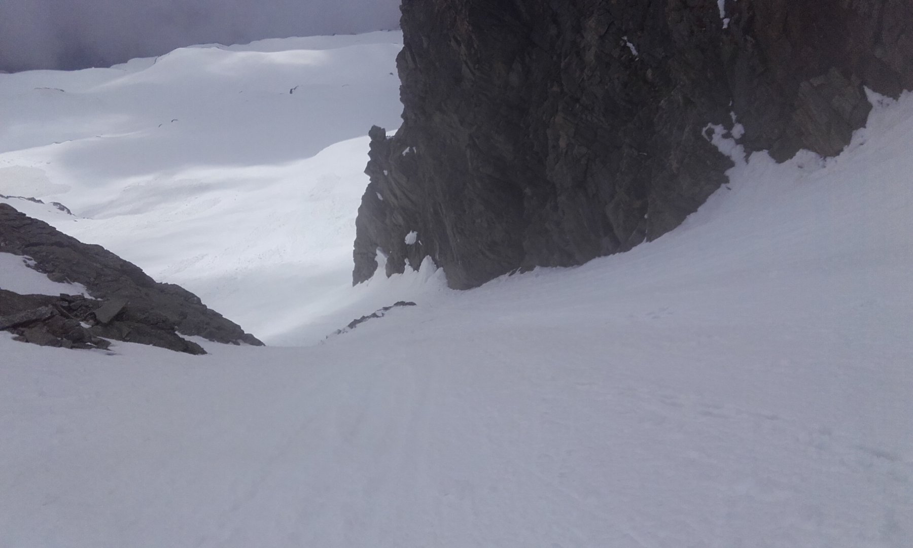 Qui si calzano gli sci seguendo l’evidente canalone di fronte e che passa sotto alle bastionate rocciose solcate da cascate (non conviene seguire l’itinerario estivo sui pendii a destra).