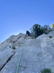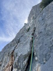- L2: Si supera un diedrino, si traversa a destra oltrepassando un fastidioso alberello fino al fix non visibile. Oltre si scala un bel diedrino sprotetto fino in sosta, 5c.