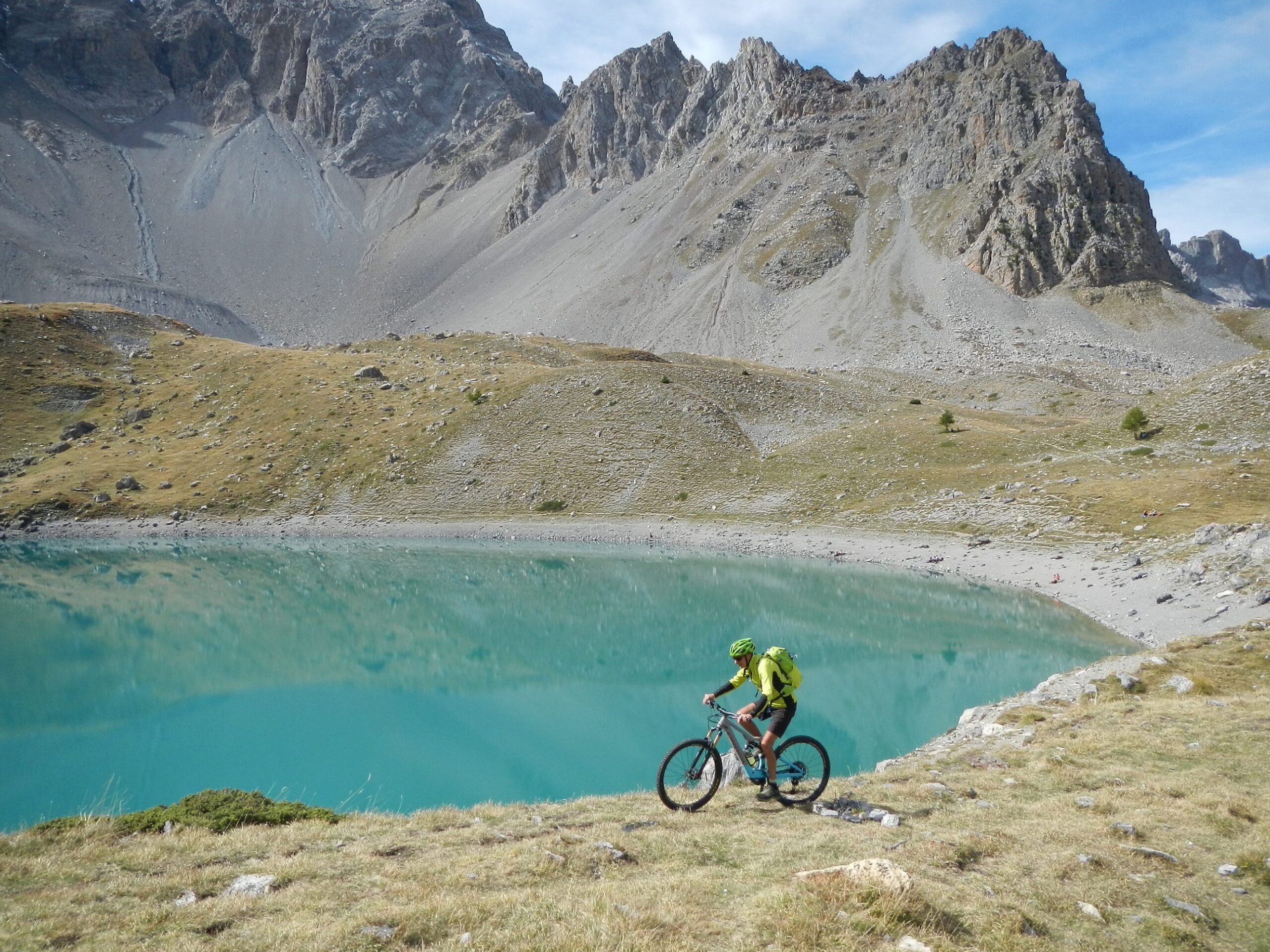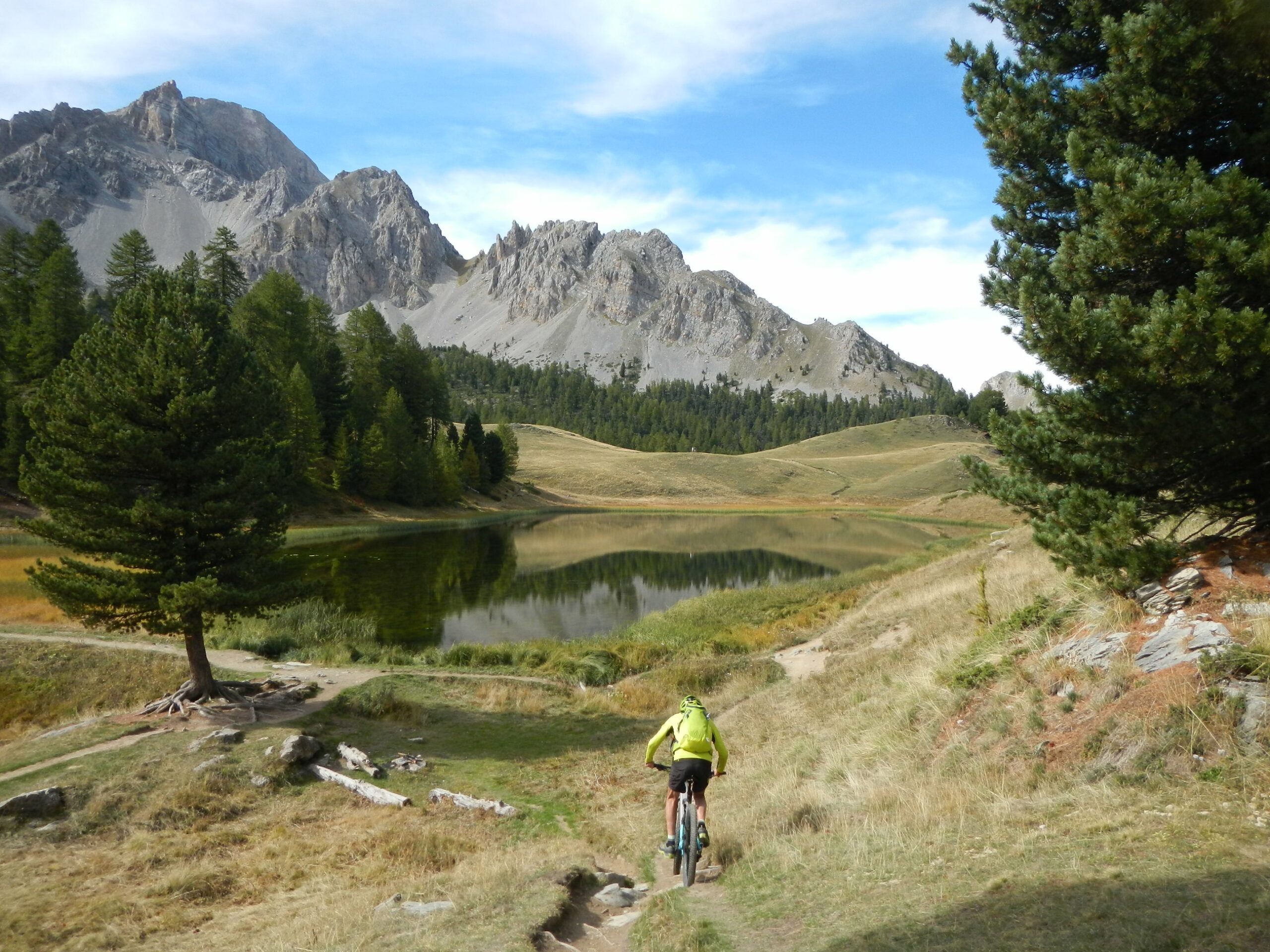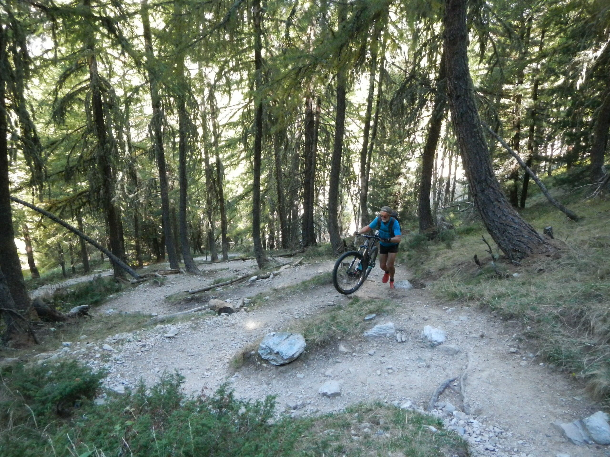 Quando il sentiero vira verso destra diventa nuovamente possibile fare tratti in sella. Continuare sino al lago Saint Anne con tratti di spintage/portage (100 metri circa) e tratti pedalando. Dal lago salire verso il col Girardin: anche qui tratti pedalabili e tratti nei quali occorre spingere (dipende dalla gamba.. considerare altri 100 metri di spinta)