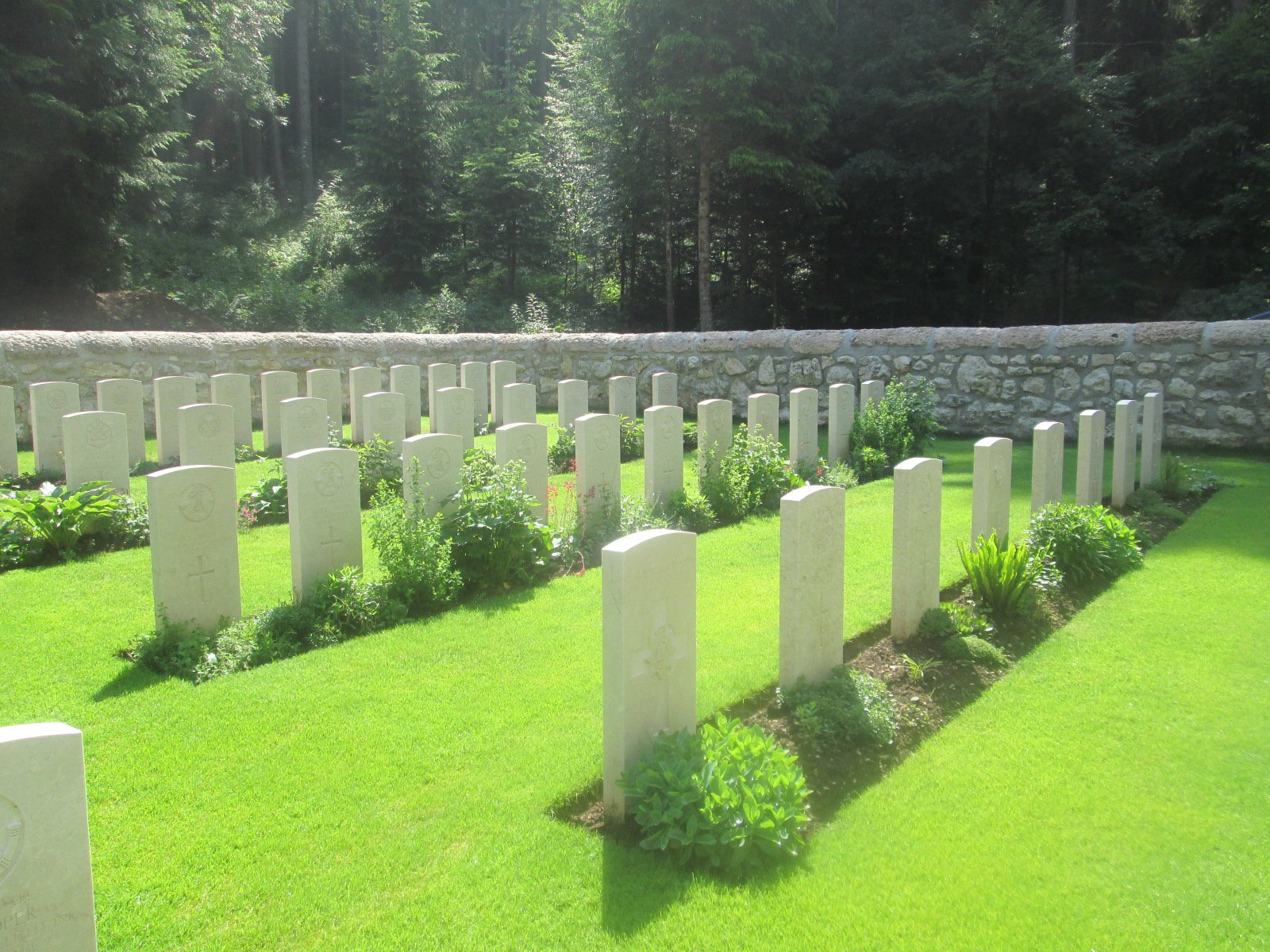 Superato un piccolo ponte, si lascia la ex ferrovia e si imbocca a sinistra una stradina che si collega con la strada che sale verso il rifugio Boscon. Si sale quindi verso destra sulla sterrata principale, dove si incontrano prima il cimitero inglese e quindi il rifugio Boscon.