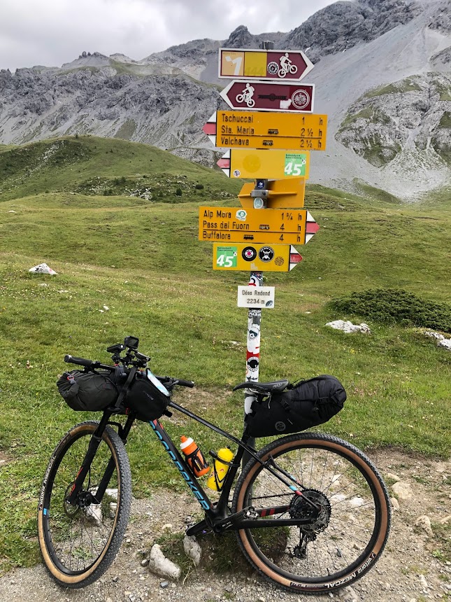 Ciclabile fino a Santa Maria Moustair quindi salita al Doss Radond, (siamo sul circuito Alpine Bike che seguirò fino a Saitn Moritz), discesa spettacolare fino al Passo di Val Mora, lago di Cancano e salita al Passo Alpisella, bella discesa fino a Livigno.