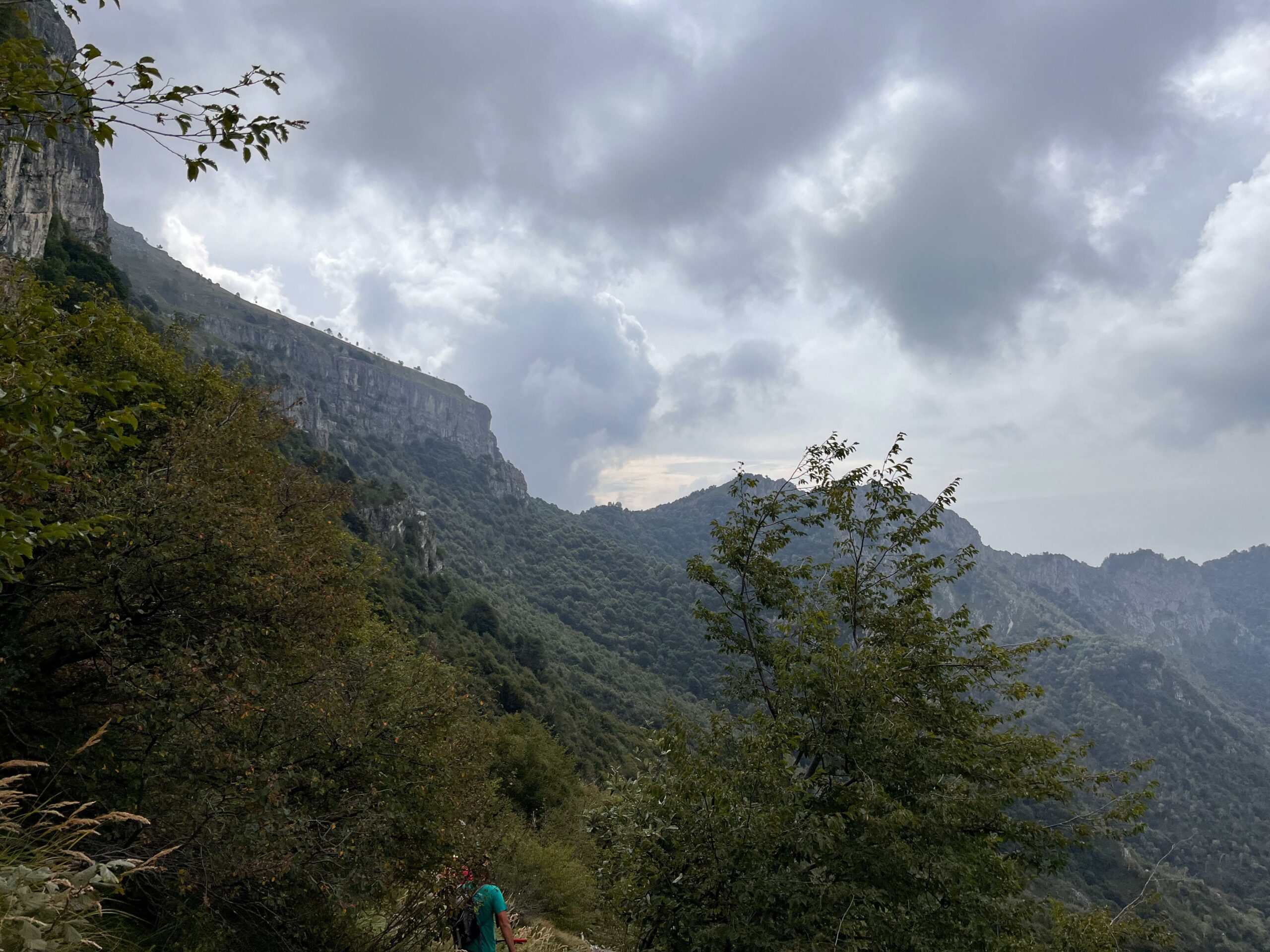 Salire su asfalto (poi sterrato) verso Costa del Pallio (1360) con sali scendi proseguire in messa costa fino al Passo del Giuff (1523) dopo una serie di scalini discesa tecnica vero piani d’Erna. Proseguire verso Passo del Fo’ con molto portage (attenzione al passaggio del torrente e alla cengia esposta con catena).