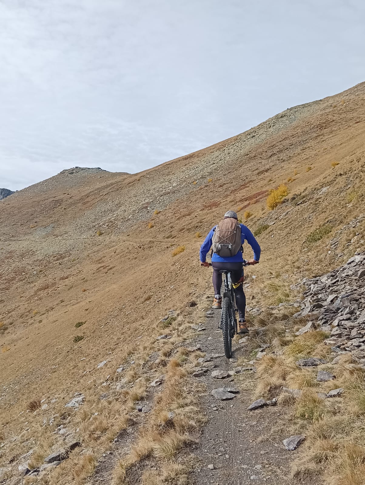 Discesa lungo il percorso di salita, i tornantini sotto il colle rappresentano il tratto più tecnico, ciclabile con un po’ di cautela, poi dopo inizia un meraviglioso e scorrevole sentiero erboso, che salvo brevi passaggi un po’ gradinati, è davvero semplice.