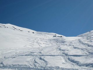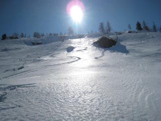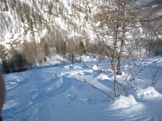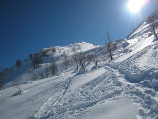Due terzi superiori in ottima neve polverosa. Si trovano ancora spazi intonsi nonostante le 20 presenze di oggi.Parte bassa prima della stradina adatta a gambe giovani, o almeno elastiche. Stradina un pò ravanata dai ciaspolari.
