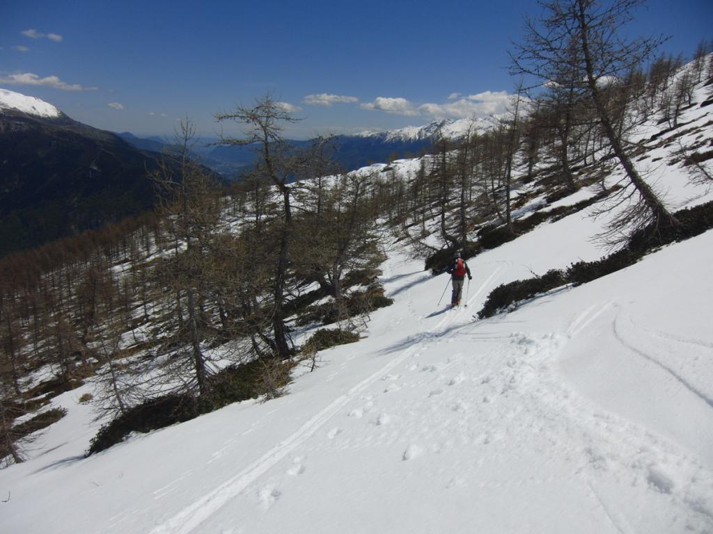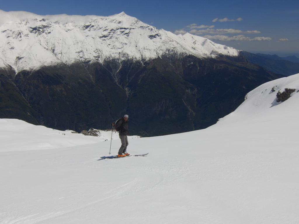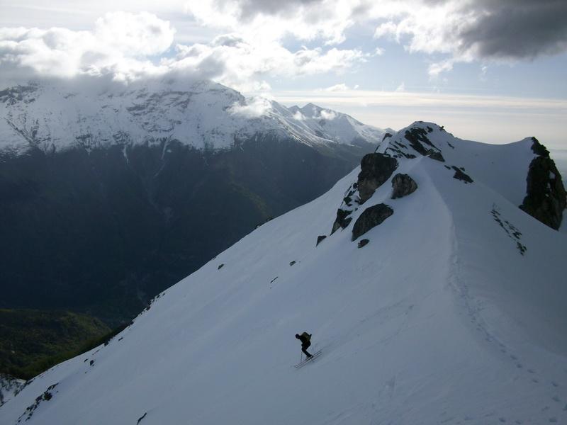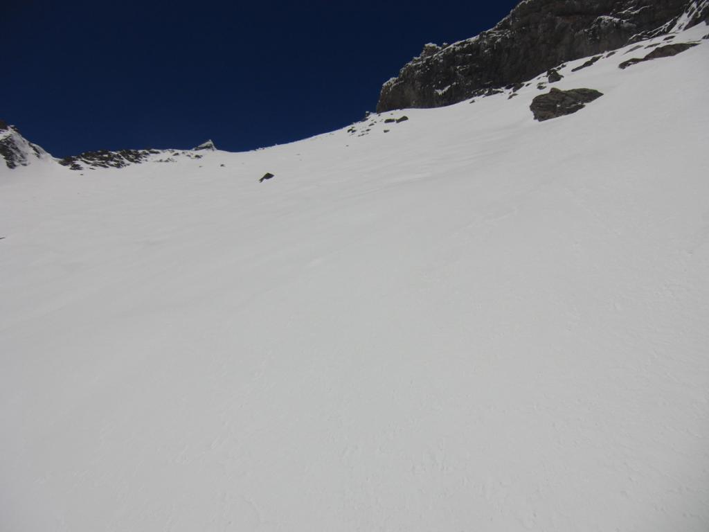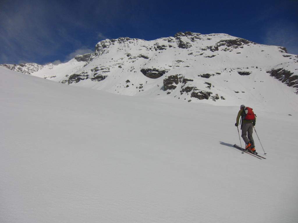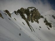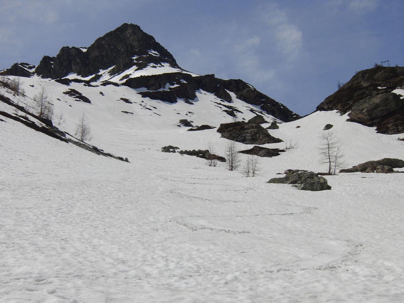 Al di sopra si giunge su un pendio alquanto ripido che va a terminare contro la base della parete rocciosa della vetta; lo si percorre diagonalmente da destra a sinistra fino ad uscire sulla crestina sud-est e tenendosi un pò più a destra di questa, superando un pendio alquanto ripido si esce direttamente in vetta.