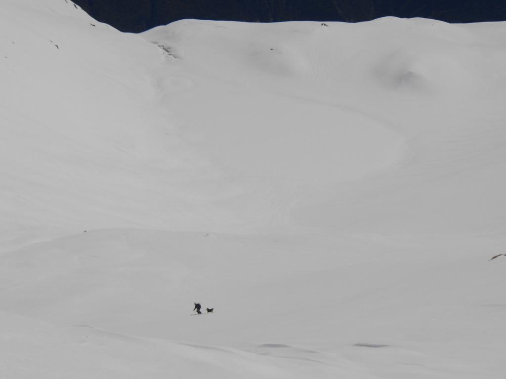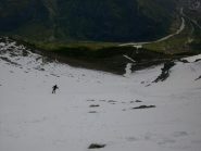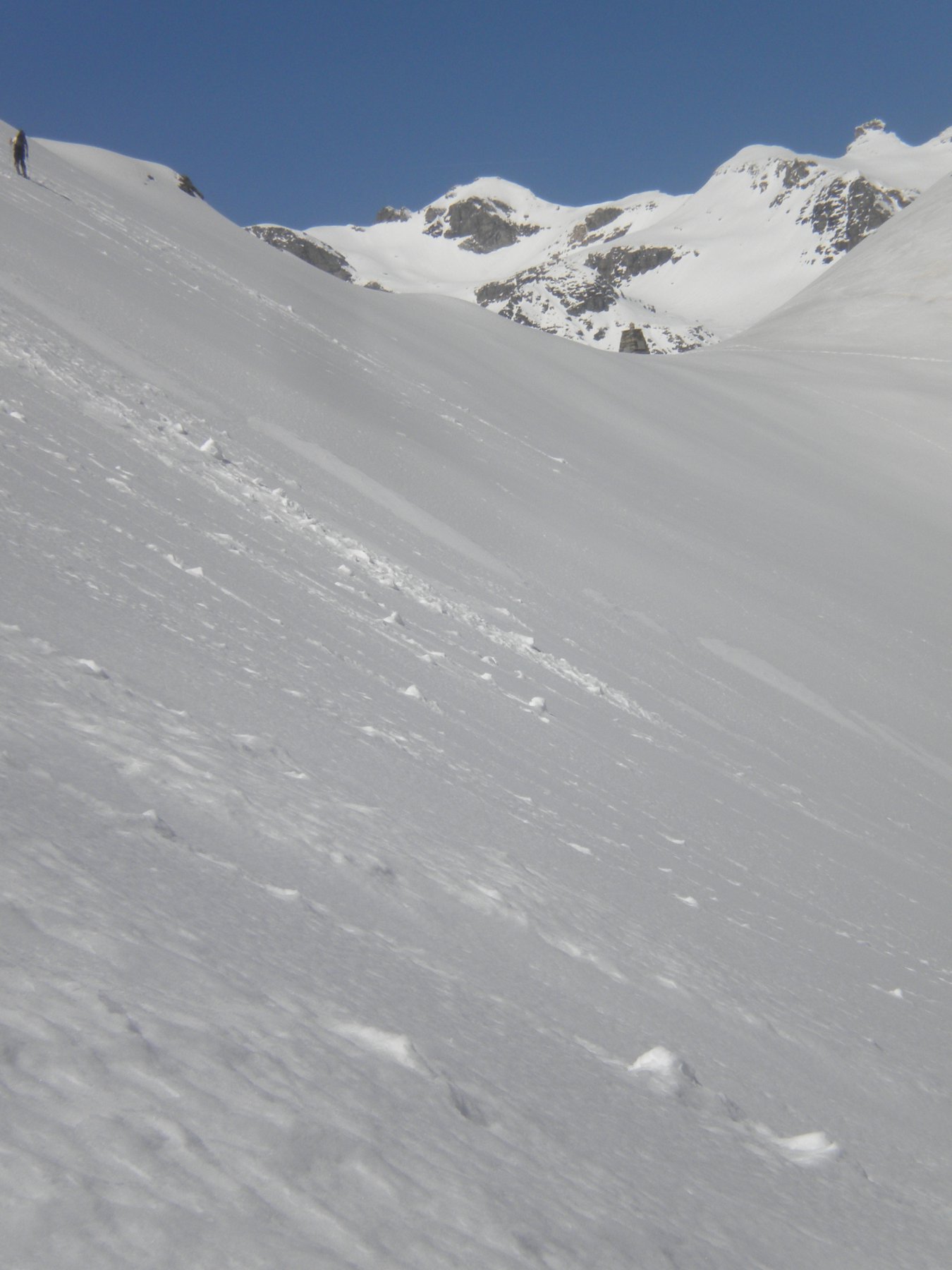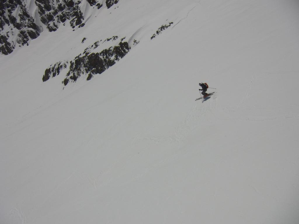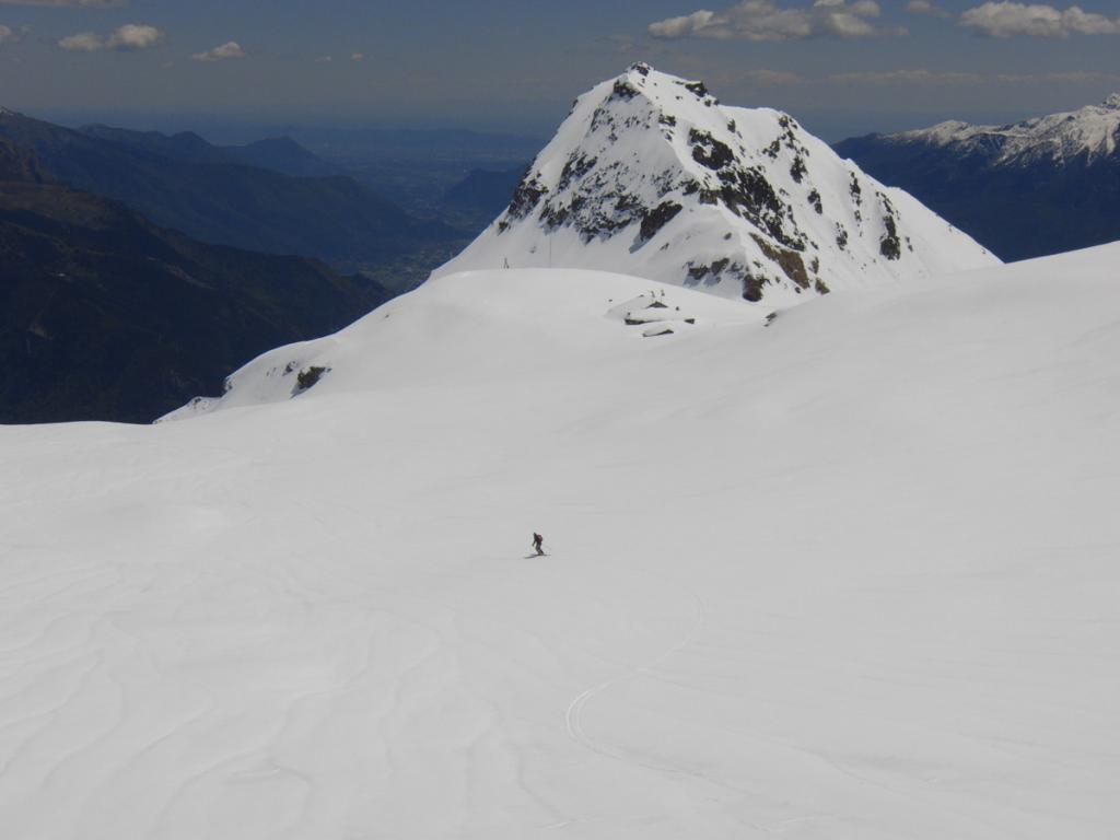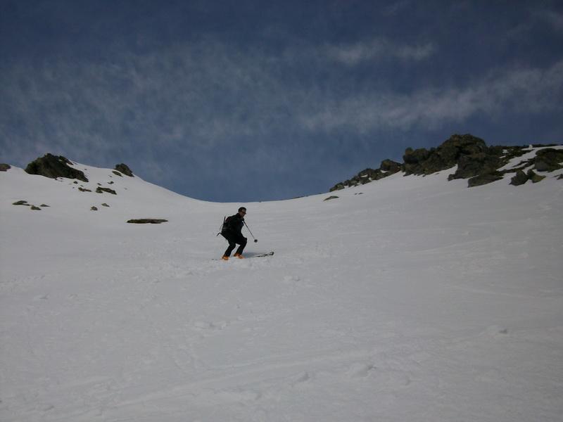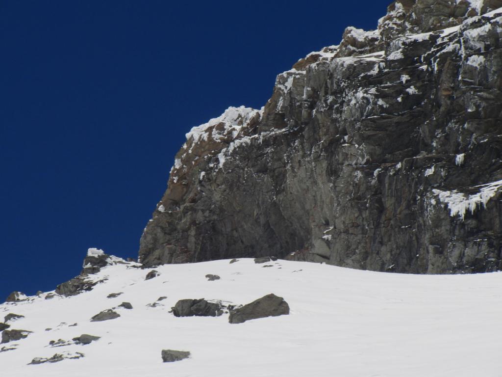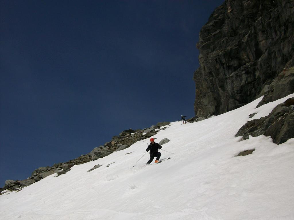 Al di sopra si giunge su un pendio alquanto ripido che va a terminare contro la base della parete rocciosa della vetta; lo si percorre diagonalmente da destra a sinistra fino ad uscire sulla crestina sud-est e tenendosi un pò più a destra di questa, superando un pendio alquanto ripido si esce direttamente in vetta.