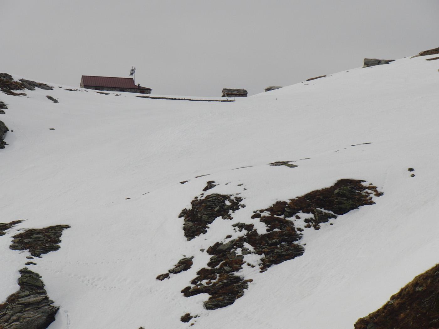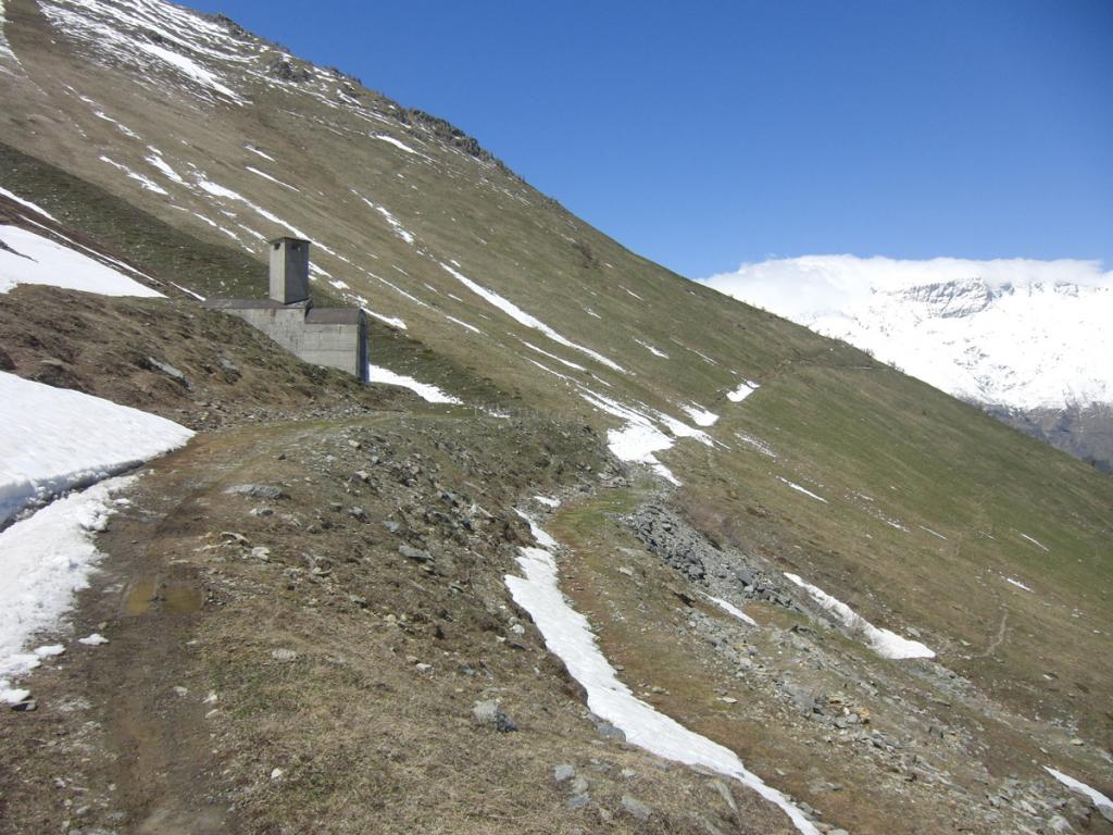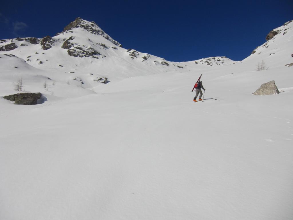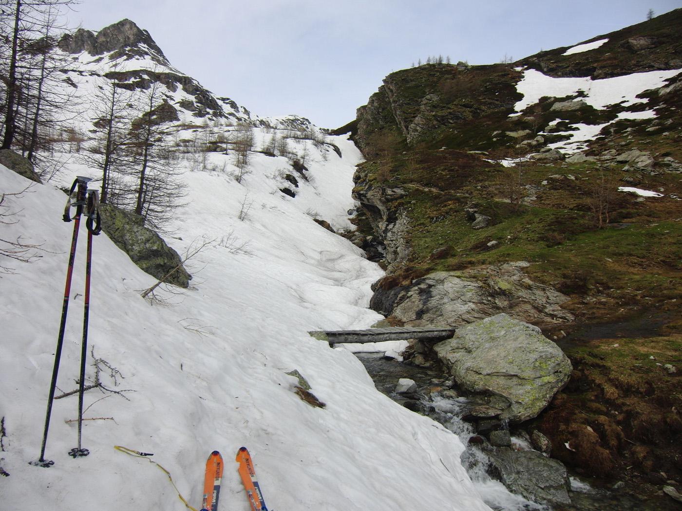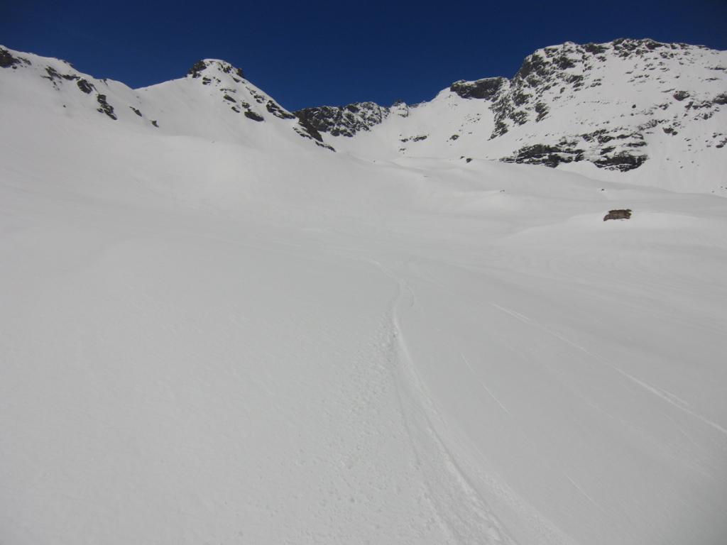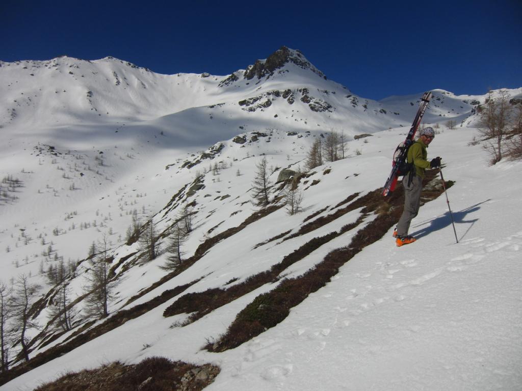 Dalla camera di carico, valicare il Rio Tillirei ed imboccare l’ampio sentiero che si dirige verso la costiera al di sopra delle Grange Marzo ed appena aggirato il costone, cambiando esposizione, normalmente si possono calzare gli sci.