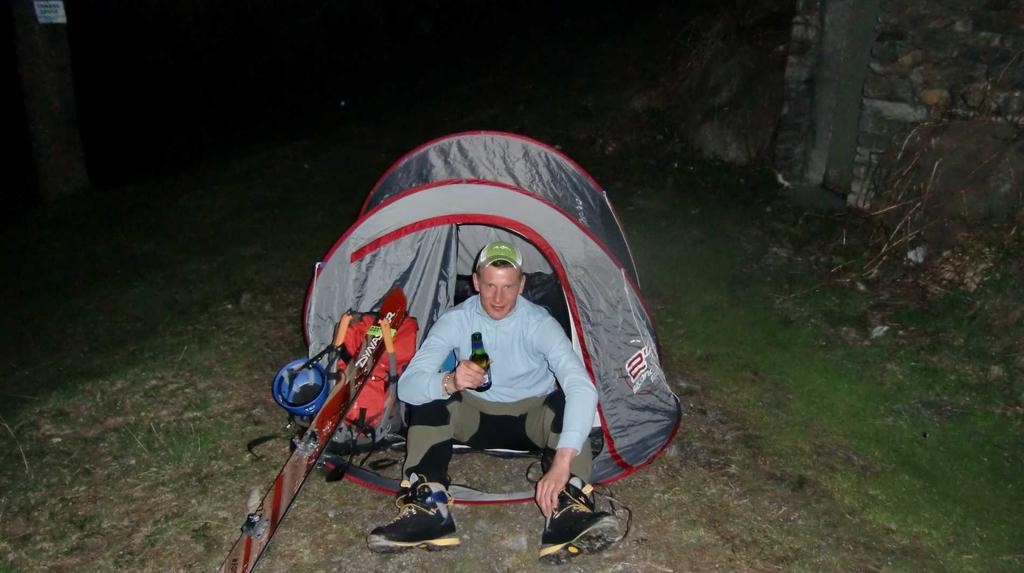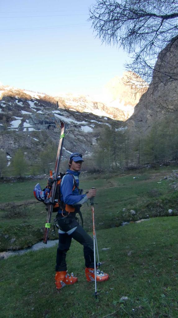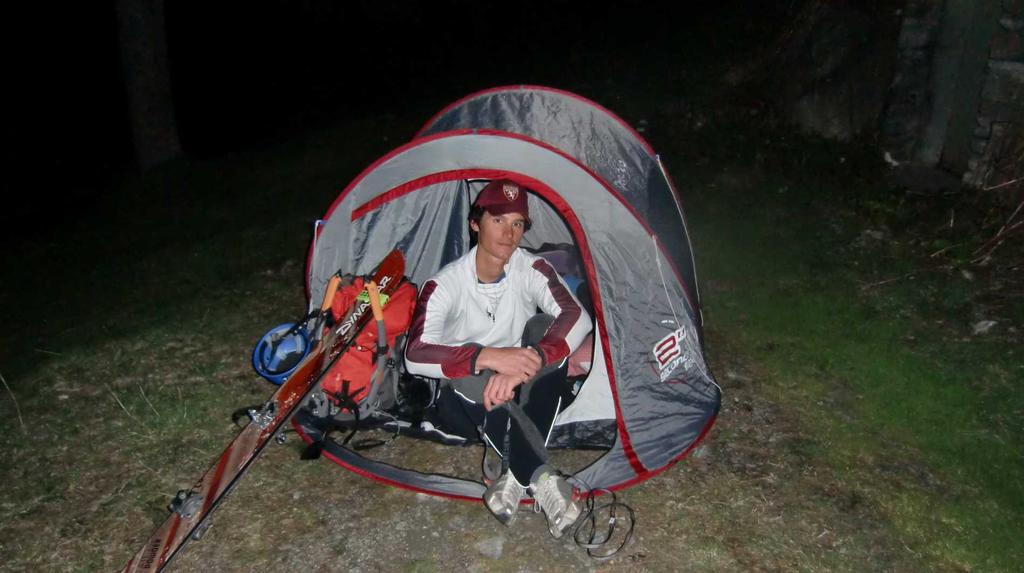 Pernottamento in tenda a pian San Nicolao e partenza alle ore 7,raggiungo la vetta passando dal canale nord alle ore 11,30;ottimo rigelo notturno e neve ancora dura,aspetto quindi che molli ancora un pò e scendo circa alle 12,30.Cornice all’ingresso,entro in parete leggermente spostato,poi con un traverso raggiungo la direttrice e dò inizio alle danze su neve perfettamente trasformata per i primi 200 metri,da quì in poi neve duretta in via di trasformazione ma con eccellente grip,gli ultimi 10 metri del canale sono rovinati da una rigola ghiacciata,quindi fuori la picca,scaletto qualche metro e sono sul traversino finale.
