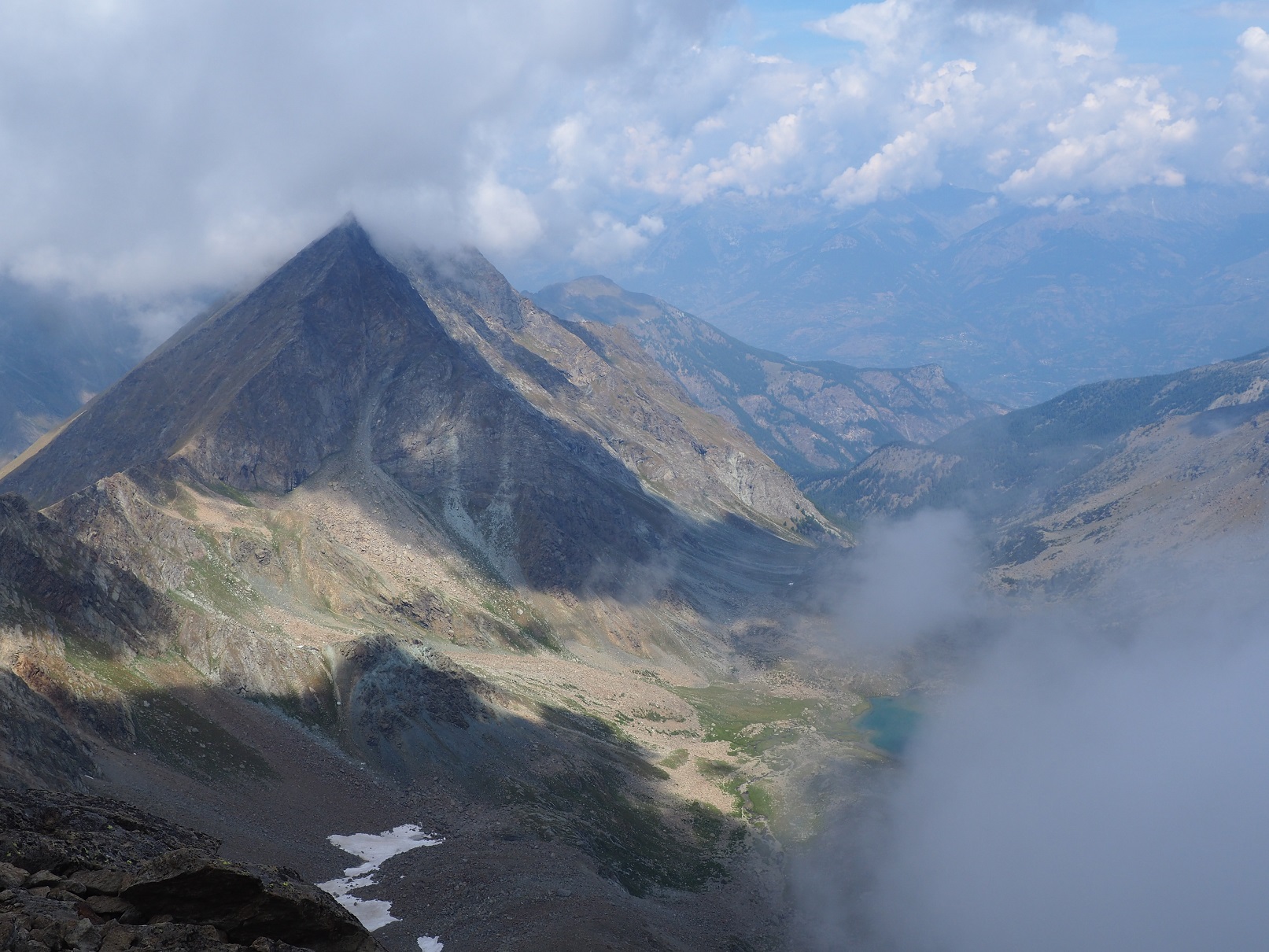 Giornata certamente non delle migliori, con nuvolosità diffusa già dal mattino a dispetto delle previsioni. Almeno fino a poco prima del Lago Gelato relativamente soleggiato anche se con umidità tropicale. Al Col Fussì abbiamo ancora potuto vedere la cima, ma già sul traverso nella pietraia il cielo si è chiuso. Per cui siamo giunti in vetta avvolti dai vapori e con solo una breve e parziale visione sul Vallone di Savoney. Poi qualche goccia di pioggia ci ha consigliato una veloce discesa, anche se poi non ha piovuto ma siamo stati accompagnati da numerosi tuoni. In vetta dopo di noi una famiglia con tre ragazzini, complimenti, ed alcuni altri escursionisti. Avvistata una splendida aquila che ha brevemente volteggiato su di noi poco prima del Lago Gelato e due giovani stambecchi nella pietraia dopo il Colle. Con Michele.