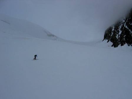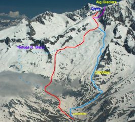 dalla sommità di questa attraversare a mezza costa un anfiteatro spesso coperto da residui valangosi e giungere sulla sponda dx or. del ghiacciaio dei Glaciers che si sale facilmente per le sue combe fino a quota 3.300 poi deviando leggermente a sx su un pendio via via più ripido fino alla selletta del Dôme de Neige (m. 3.592) poi a dx sul pendio che porta alla spalla nord.