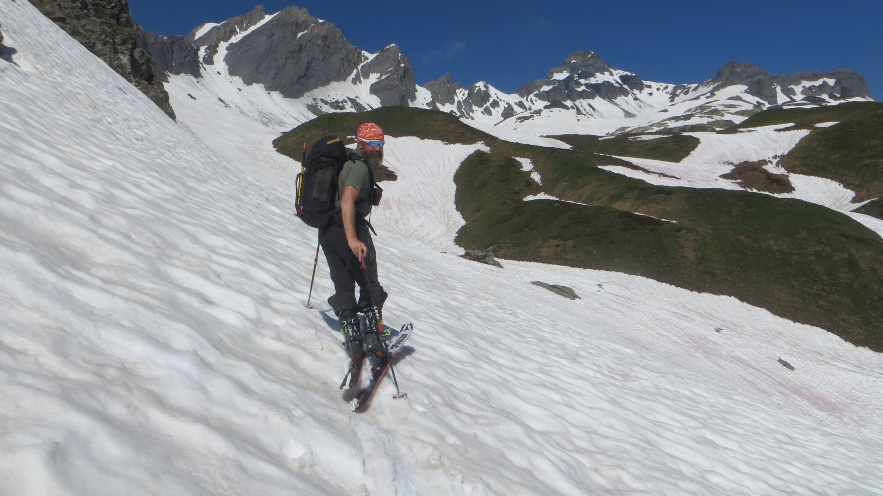 Discesa: per l’itinerario di salita oppure (più bella) da quota 3.300 raggiungere la sponda sx del ghiacciaio (prestare attenzione ai crepacci) a fianco della cresta rocciosa delle Cabottes e scendere direttamente su pendii molto sostenuti fino in fondo al vallone raggiungendo il rio Lanchettes ed il punto di partenza.