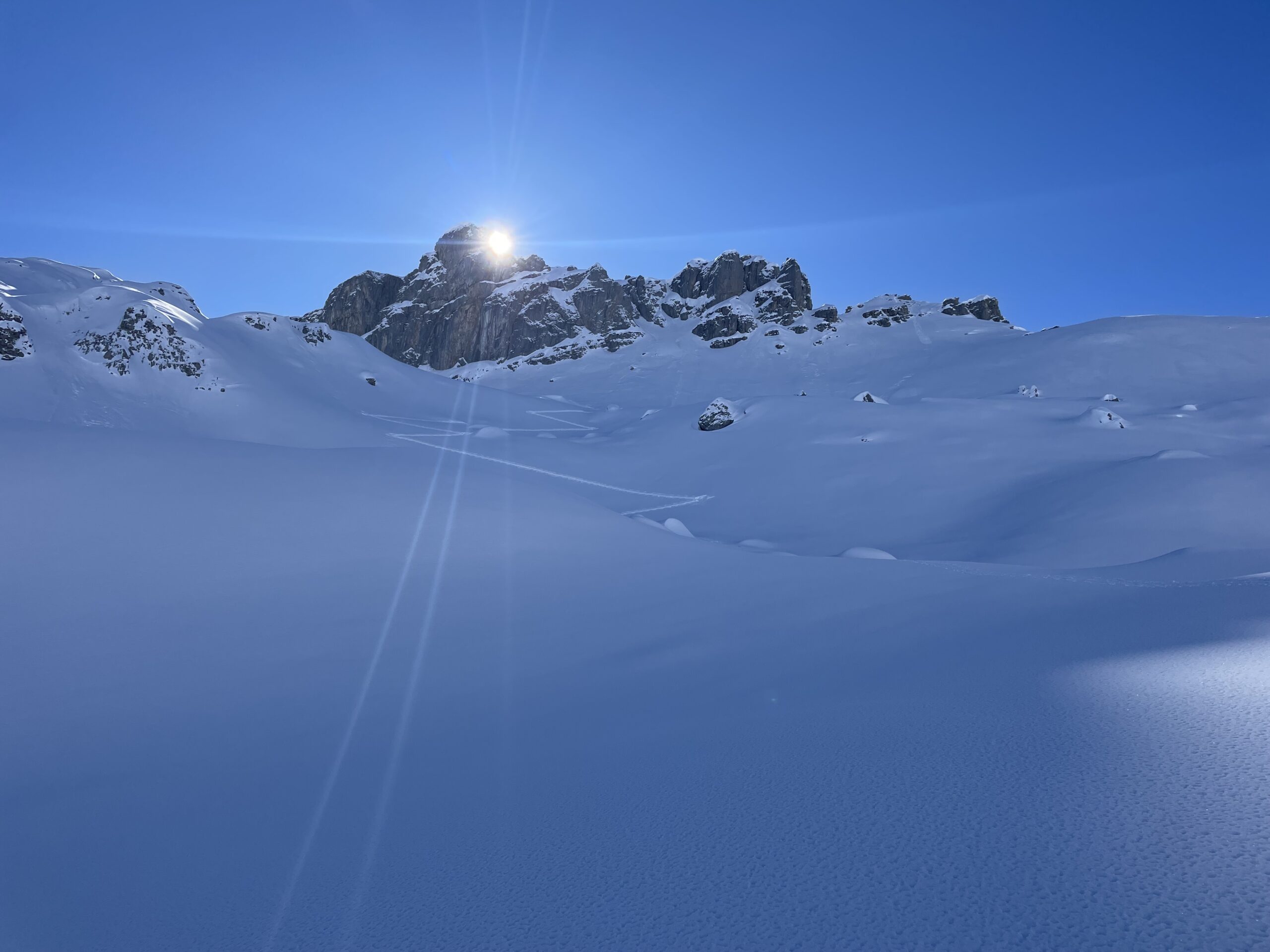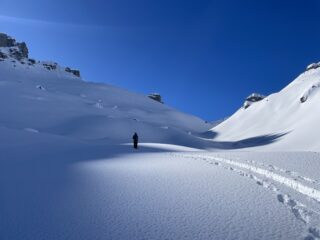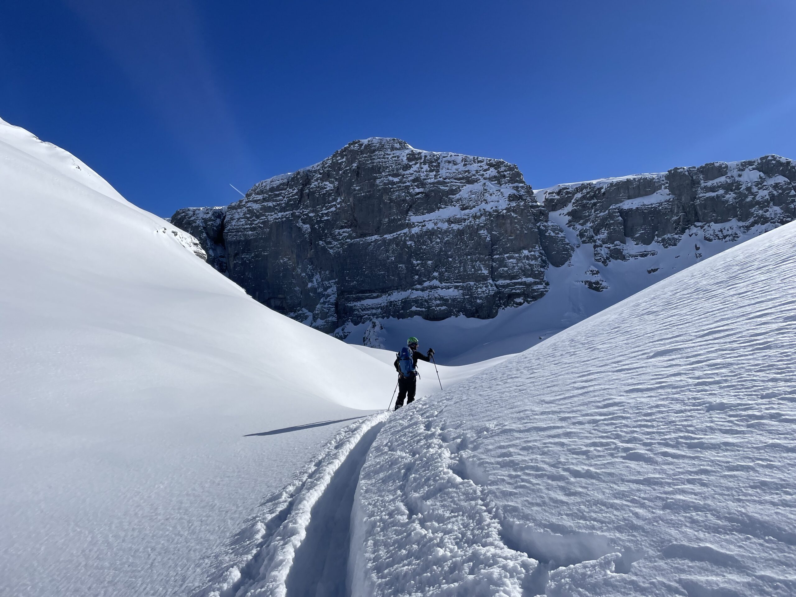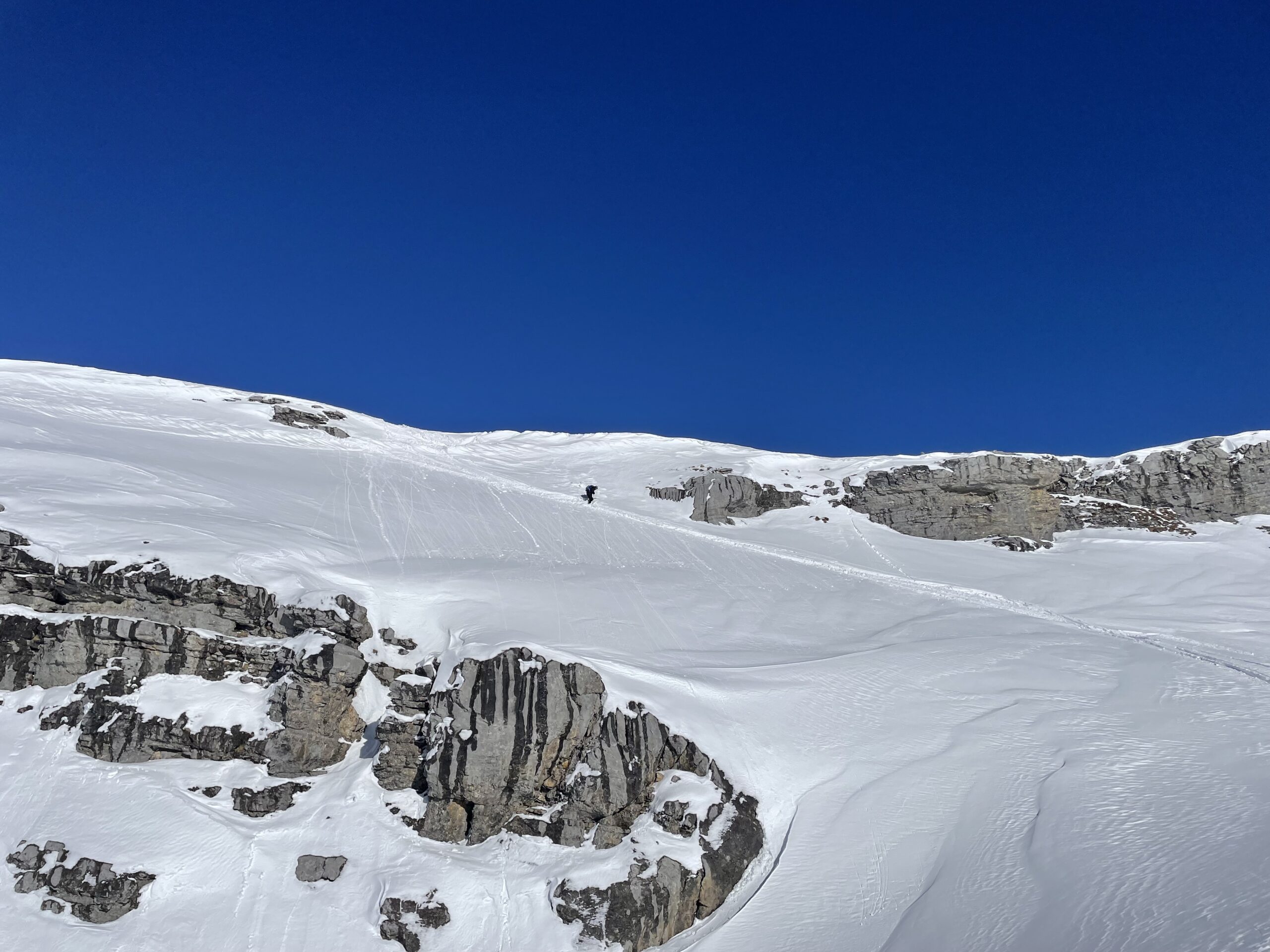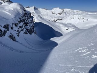 Uno splendido canalone non particolarmente ripido ma con un poco di attenzione e da affrontare solo con condizioni ottimali.